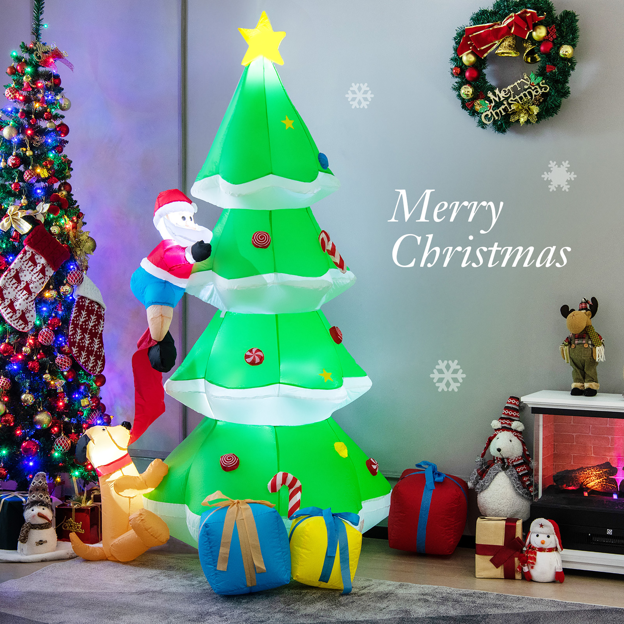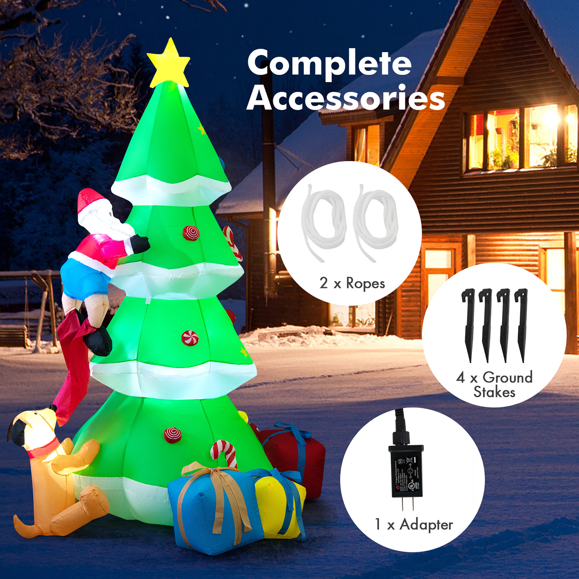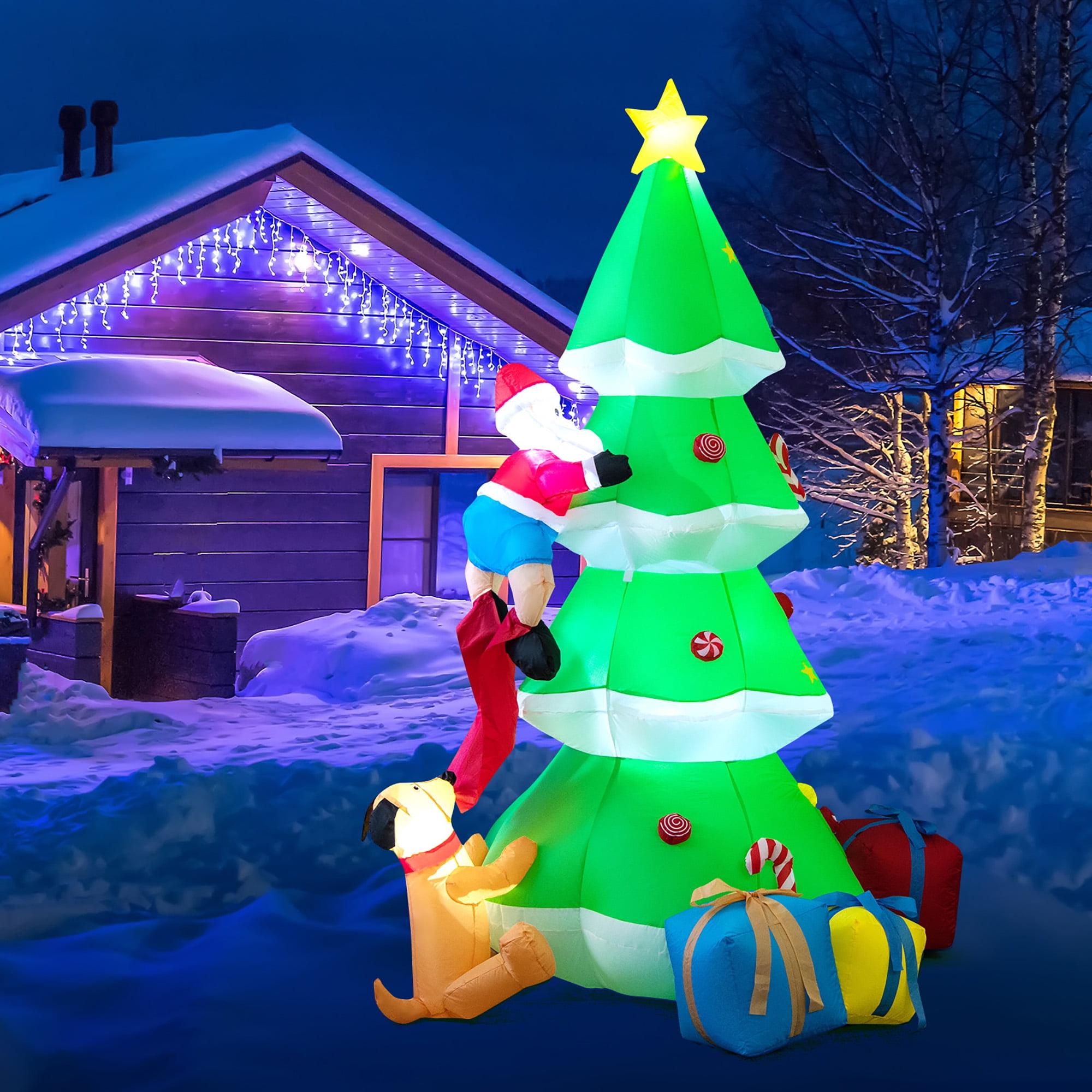 Fun and Memorable Ambience: The inflatable Santa Claus is climbing a big Christmas tree chased by a puppy,which looks so funny and will please all your neighbors and guests. More,sparkling star on the top,multi-colored candy ornaments on the tree and colorful gift boxes create a strong and warm festive atmosphere. Glowing Christmas Decoration: This Christmas decoration comes with bright LED lights to make it more vivid and realistic,realizing better viewing effect at night and creates a memorable scene during Christmas. Every kids would like to have their own Christmas tree and play with them in winter. Excellent Craftsmanship: This well-designed inflatable Christmas tree is made of high quality polyester fabric that features waterproof,abrasion resistant and tear resistant. Plus,the fine and tight sewing further enhances the durability,which will accompany you and your family through more than one holiday. Quick Inflation & Easy Storage: The Christmas tree is equipped with waterproof air blower,which makes it easy to blow up in 2-4 minutes. In addition,the zipper is convenient to deflate and prevents air leakage effectively. When not in use,you can fold the inflatable decor into a compact size and store it in the corner. More Stable for Outdoor Use: The package comes with 4 stakes and 2 ropes to help you secure the inflation Christmas decoration to the ground,which is not easy to blow away in poor weather. Moreover,additional built-in sandbag highly improves overall stability when used outdoors. Waterproof polyester fabric features long service life and excellent durability Powerful air blower ensures quick and easy inflation in a few minutes Smooth zipper is convenient to deflate the inflatable Christmas tree Ground stakes,built-in sandbag and ropes are provided for higher stability Perfect inflatable decoration for lawn,party,courtyard,etc