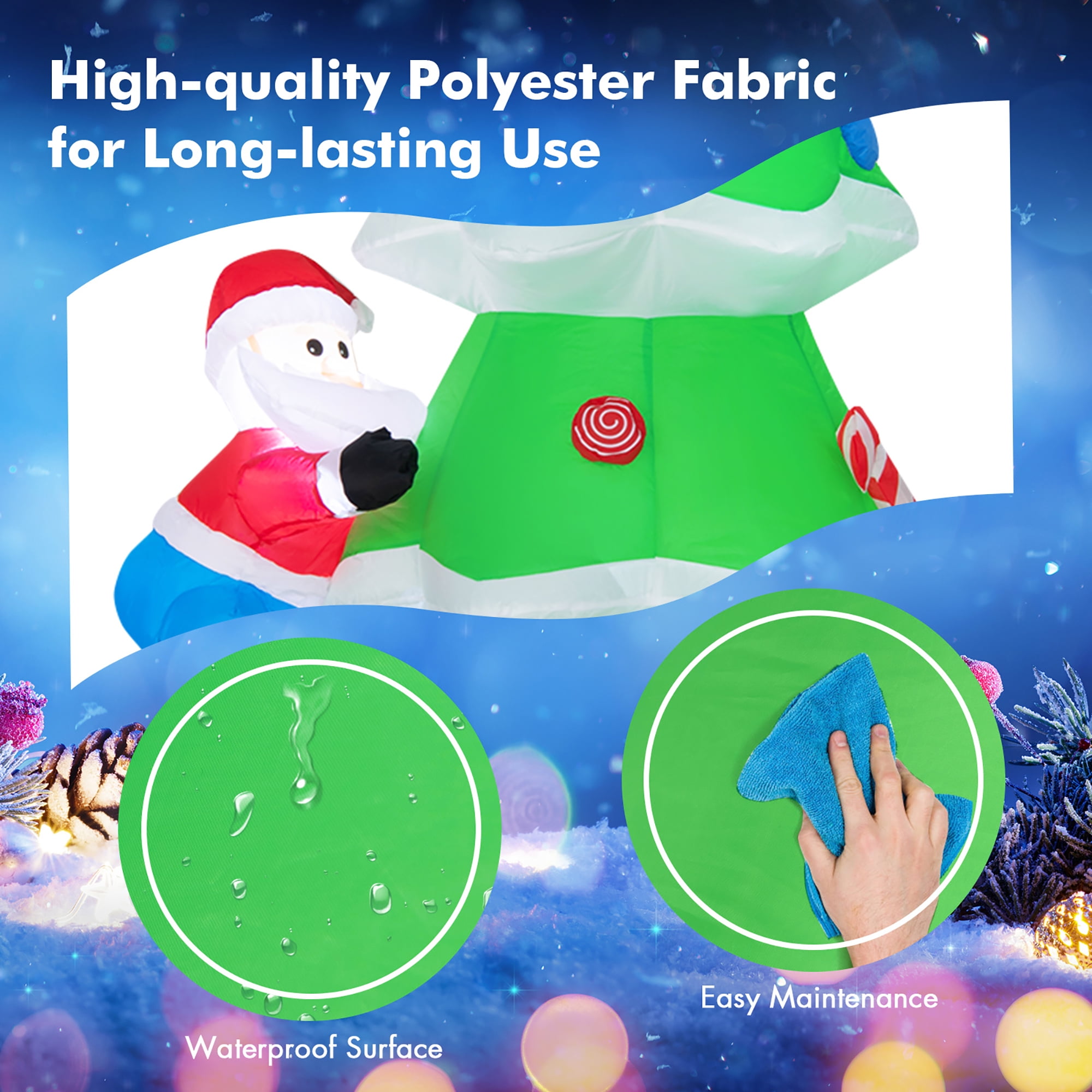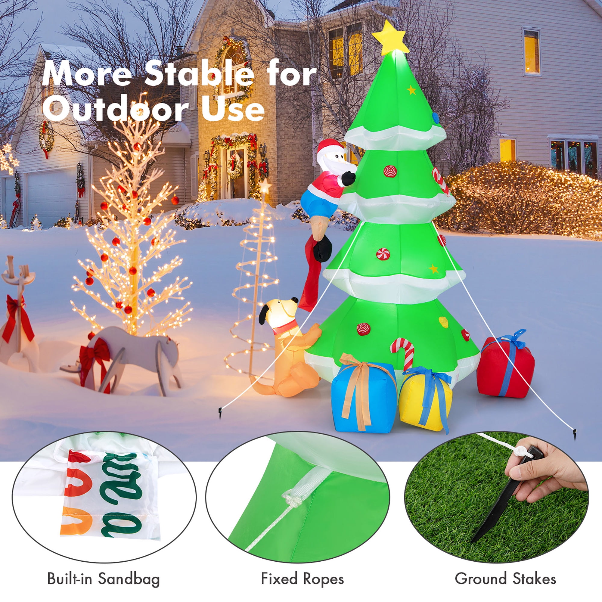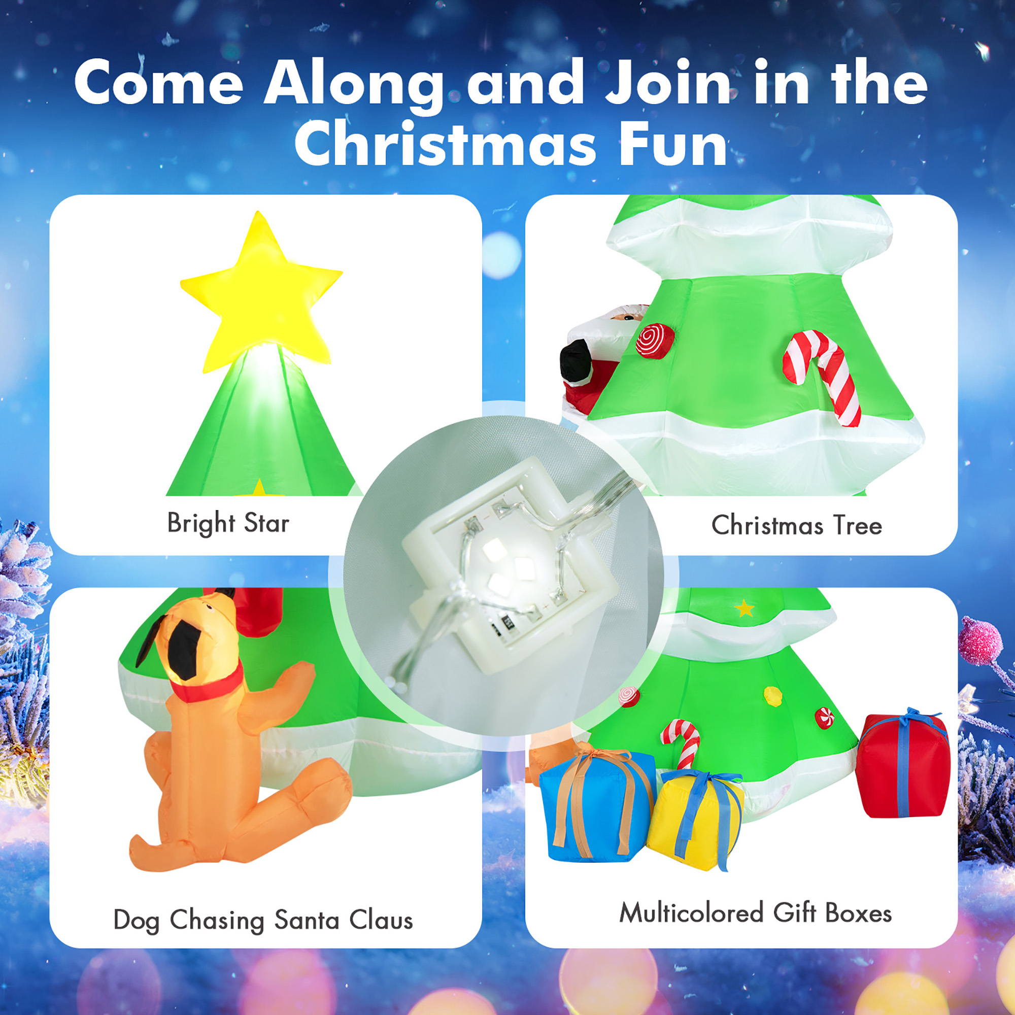 Fun and Memorable Ambience: The inflatable Santa Claus is climbing a big Christmas tree chased by a puppy,which looks so funny and will please all your neighbors and guests. More,sparkling star on the top,multi-colored candy ornaments on the tree and colorful gift boxes create a strong and warm festive atmosphere. Glowing Christmas Decoration: This Christmas decoration comes with bright LED lights to make it more vivid and realistic,realizing better viewing effect at night and creates a memorable scene during Christmas. Every kids would like to have their own Christmas tree and play with them in winter. Excellent Craftsmanship: This well-designed inflatable Christmas tree is made of high quality polyester fabric that features waterproof,abrasion resistant and tear resistant. Plus,the fine and tight sewing further enhances the durability,which will accompany you and your family through more than one holiday. Quick Inflation & Easy Storage: The Christmas tree is equipped with waterproof air blower,which makes it easy to blow up in 2-4 minutes. In addition,the zipper is convenient to deflate and prevents air leakage effectively. When not in use,you can fold the inflatable decor into a compact size and store it in the corner. More Stable for Outdoor Use: The package comes with 4 stakes and 2 ropes to help you secure the inflation Christmas decoration to the ground,which is not easy to blow away in poor weather. Moreover,additional built-in sandbag highly improves overall stability when used outdoors. Waterproof polyester fabric features long service life and excellent durability Powerful air blower ensures quick and easy inflation in a few minutes Smooth zipper is convenient to deflate the inflatable Christmas tree Ground stakes,built-in sandbag and ropes are provided for higher stability Perfect inflatable decoration for lawn,party,courtyard,etc