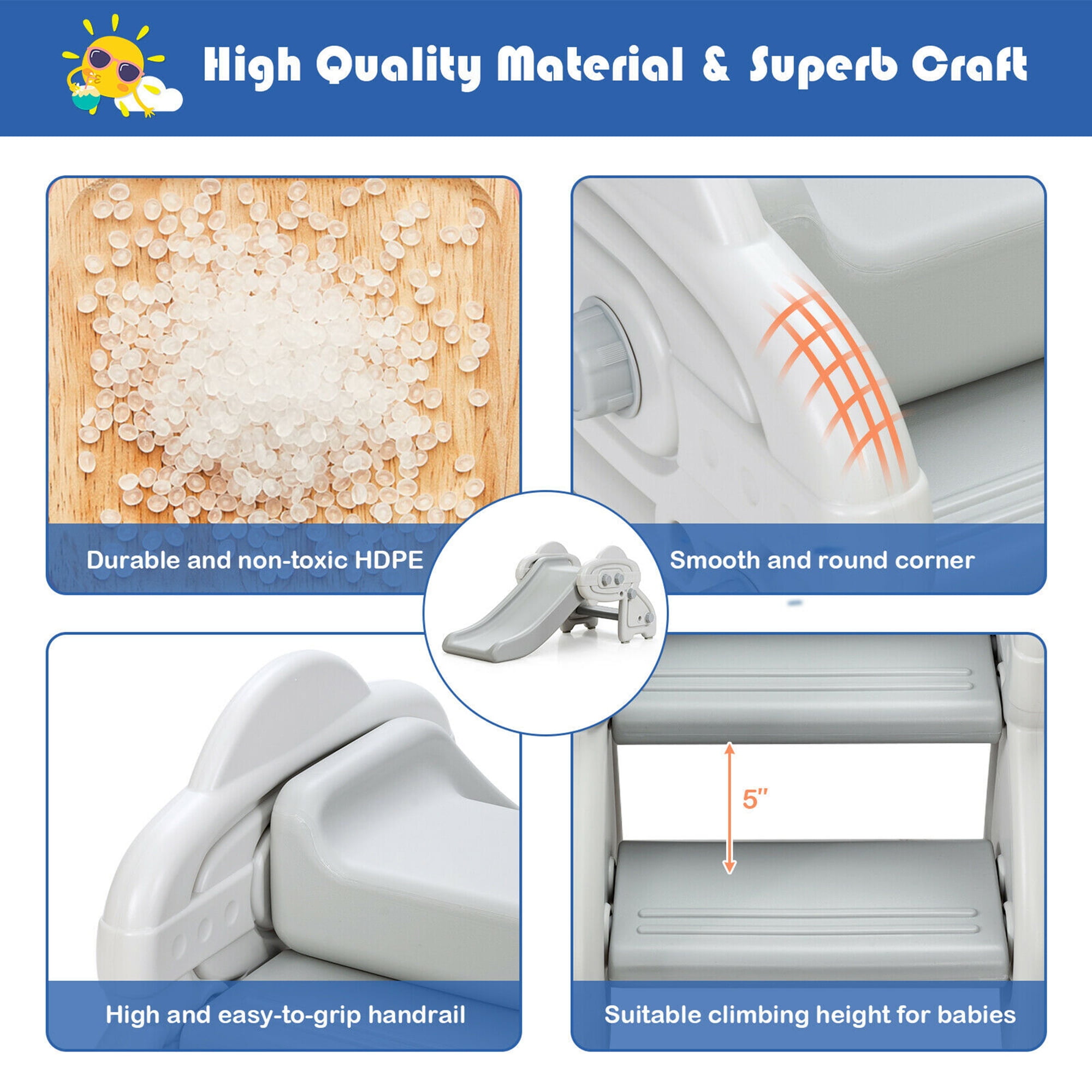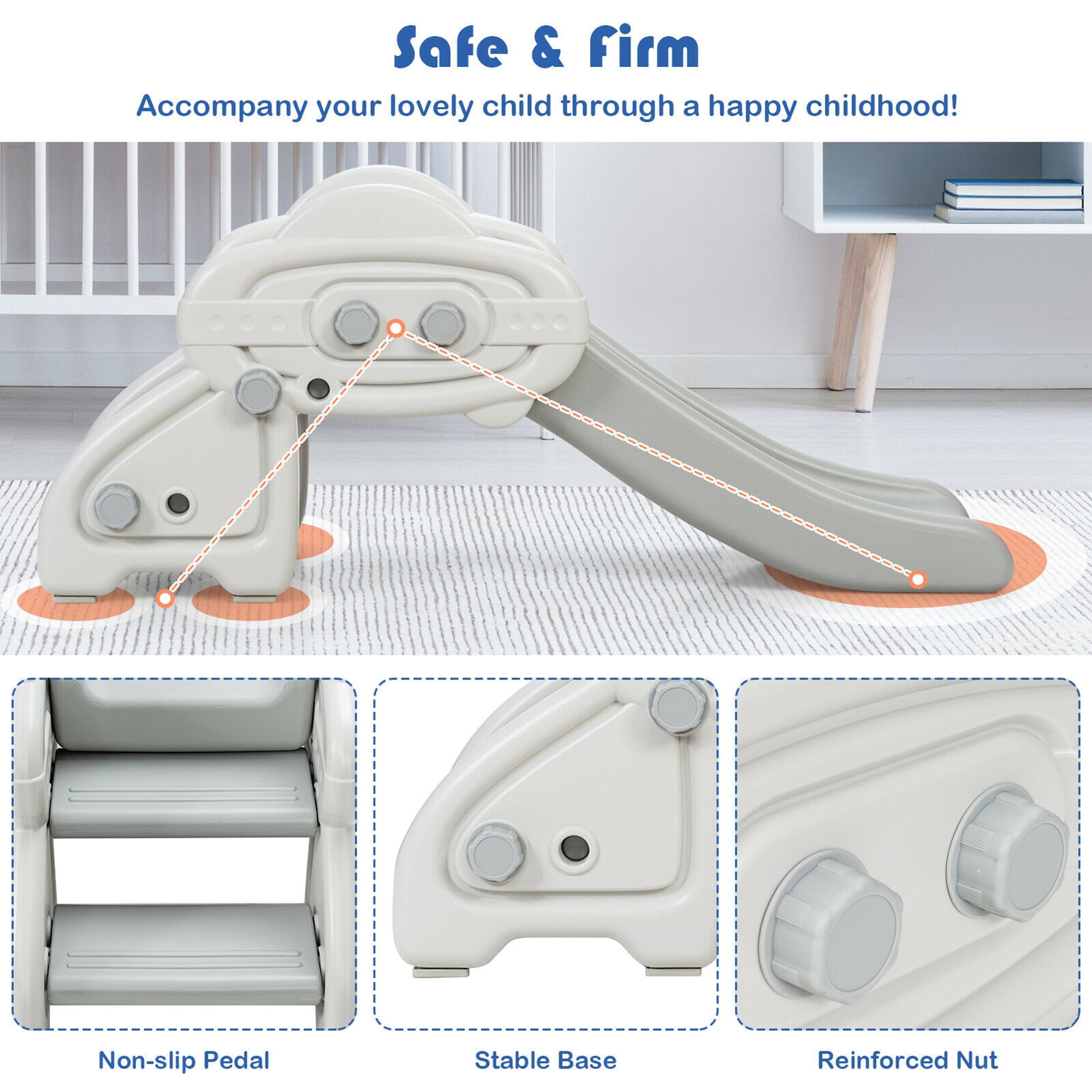Description: Our freestanding kid slide is dedicated to bringing fun and happiness to children in a safe environment. The handrails are a little higher than the normal slide handrails, allowing kids to climb the steps easier. In addition, the non-slip pedals and foot pads prevent the baby from falling down easily when climbing due to poor stability. The slide slope is gentle enough for the kids to climb by themselves. Meanwhile, the smooth slide is made of durable HDPE material, which is safe and environmentally friendly. The triangular structure design between the steps and the kid slide provides a stable base. Along with the detailed instruction, it is for ease of assembling this slide without tools. Features: Steps with non-slip design to prevent baby from falling down Spacious pedals provide ample space for children to climb Higher handrails are designed for easy grip Specification: Color: Gray Material: HDPE Product Dimension: 46 x 19.5 x 19.5 inch / 116.5 x 49 x 49 cm (L x W x H) Net Weight: 12 lbs / 5.5 kg Maximum Weight: 44 lbs / 20 kg Suitable Age: 6 months+ Package Includes: 1 X Kid Slide