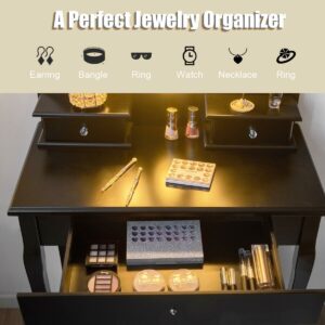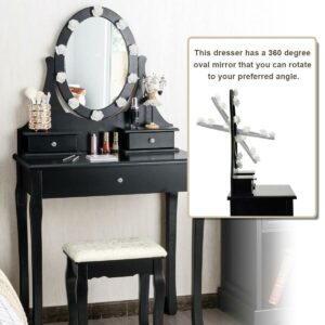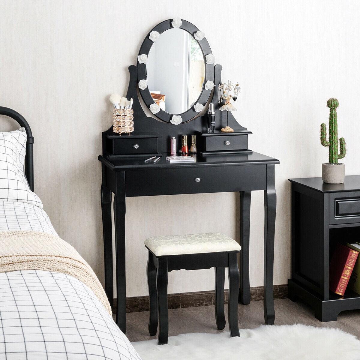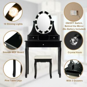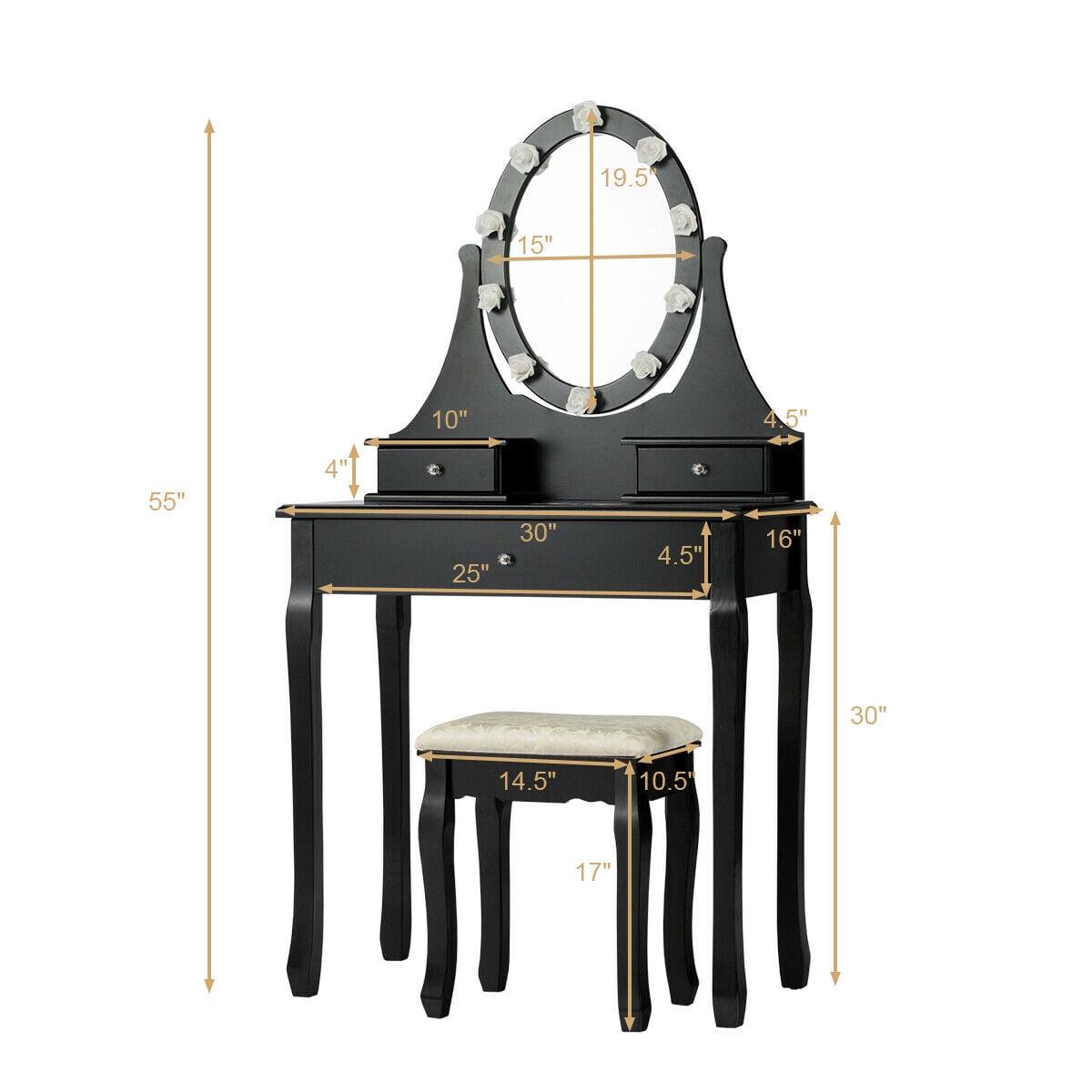Gymax Bedroom Vanity Set Makeup Dressing Table w/3 Drawers 10 LED Bulb Black