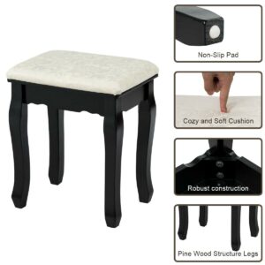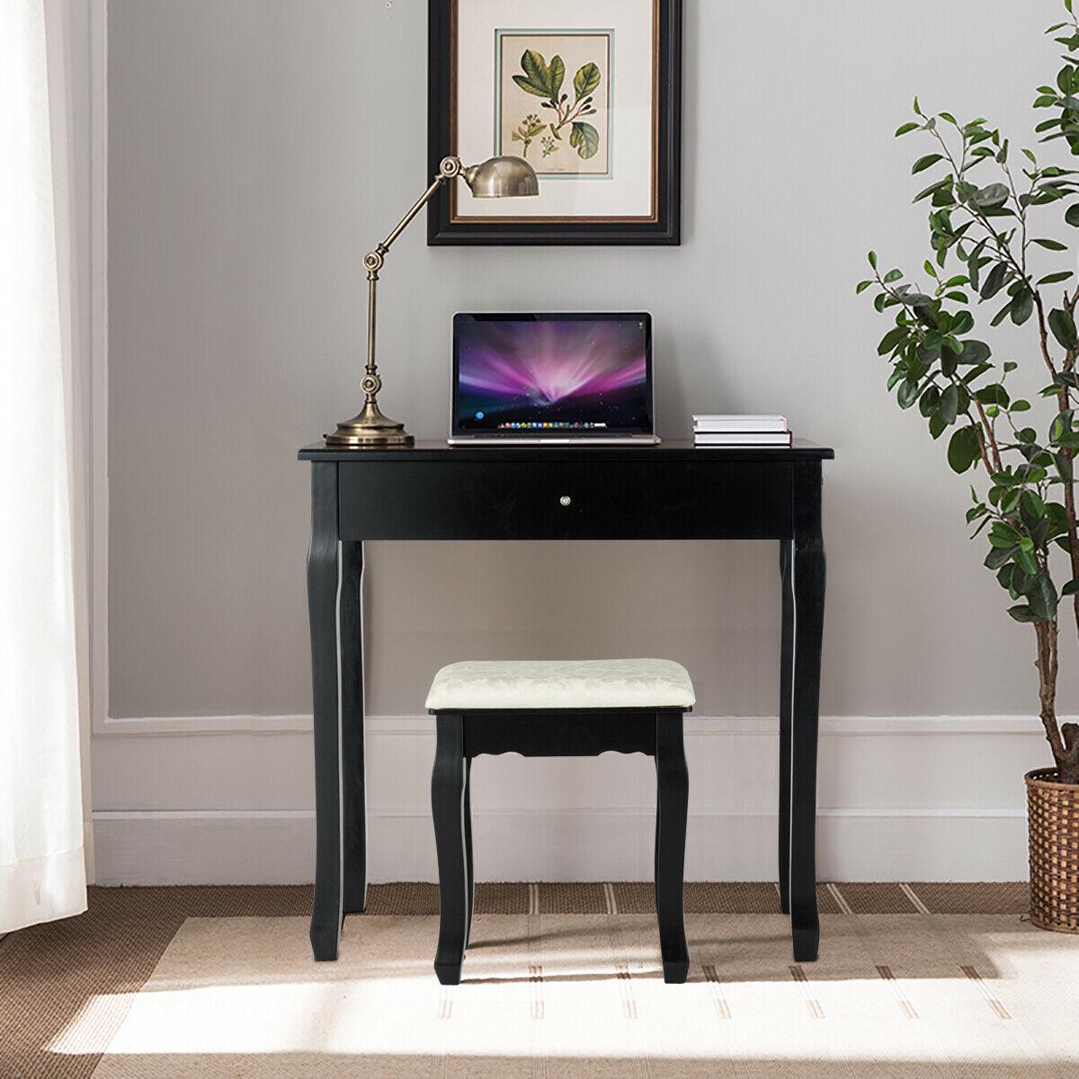 Our black dressing table can give you a perfect makeup experience. The 360-degree rotatable mirror allows you to easily adjust the required angle. The design of 3 drawers can meet your needs for space to storage cosmetics and jewelry. The pine wood legs make the dresser more stable and have a longer service life. The elegant style of the dressing table makes it ideal for decorating your home. It is suitable for places such as bedroom, living room and other places. A cushioned stool will make you feel more comfortable while you’re putting on makeup.Get your perfect make-up experience started with our product!
