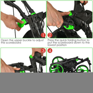 – Comfortably Adjustable Handle: Both teenagers and adults will enjoy great convenience from this golf cart as its height can be adjusted by 4 positions through the handle to accommodate people of different heights. Besides, the handle is covered with thick rubber which is anti-skid and has good sweat absorption, providing you comfortable grip. Moreover, the golf cart is equipped with a professional magnetic scoreboard, providing you with the most expert golf experience.