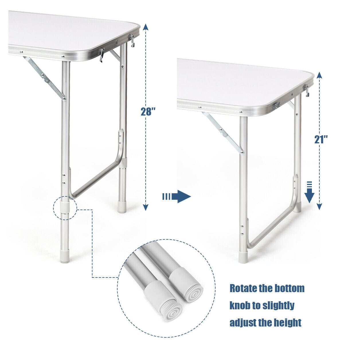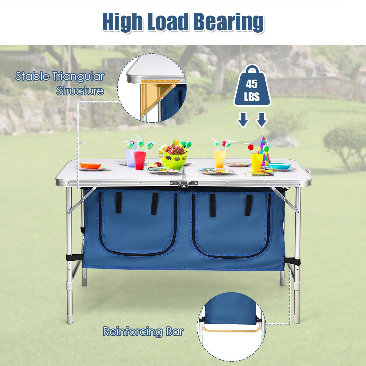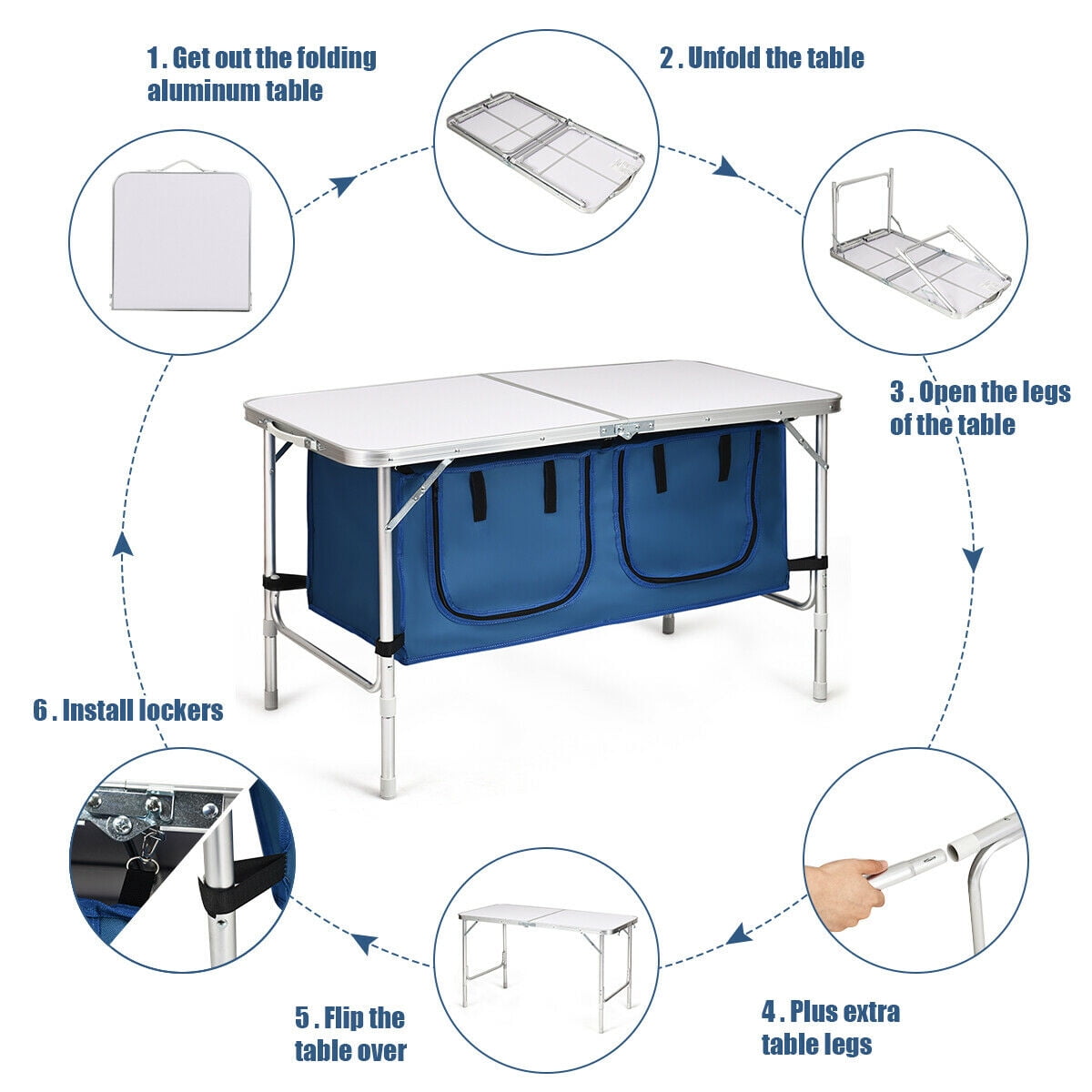 Description: Our portable aluminum folding table is perfect for barbecues, parties, and picnics. The foldable design and compact size make our tables very easy to carry and transport. Detachable table legs give you two different heights. In addition, you can easily adjust the height and balance of the table by rotating the knobs at the bottom of the table legs. The triangular structure and reinforcement measure greatly improve the stability and load-bearing capacity of the table. More importantly, our outdoor folding table has a large storage area. When you have finished assembling the table, you can put food, drinks or utensils into the locker. Pick a nice day and bring our folding table for a picnic with the family. Features: Premium aluminum and strong structure enable it to bear up to 45lbs Light weight and compact size make it easy to carry and store Multi-purpose table for picnic, barbecue, party, camping Specification: Color: White + Dark Blue Material: Aluminum + Density Plate + Oxford Cloth Product Dimension: 47.5” x 24” x 21”/28” Weight Capacity: 45 lbs Adjustable Height: 21”/28” Locker Dimension: 37.5” x 18” x 16” Board Size: 18” x 18” Package includes: 1 x Aluminum Table with Lockers 1 x Instruction