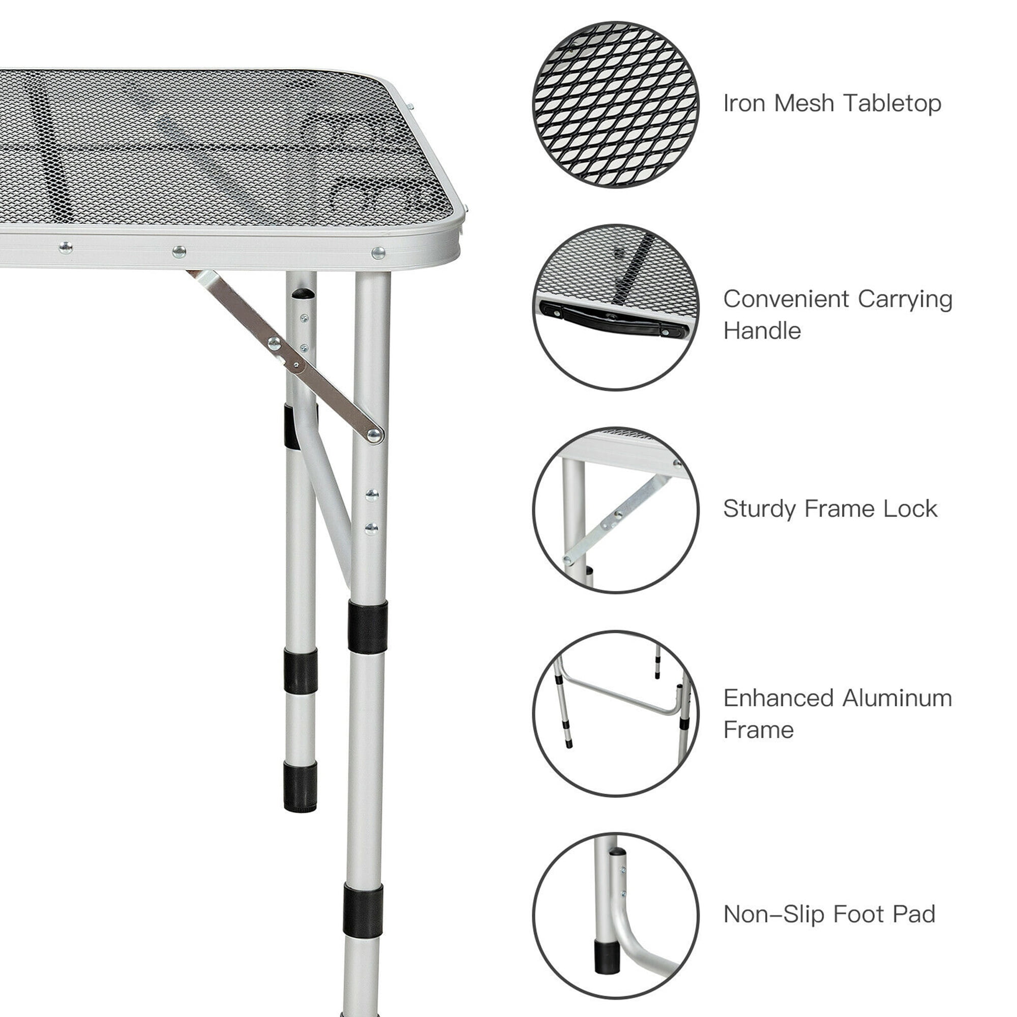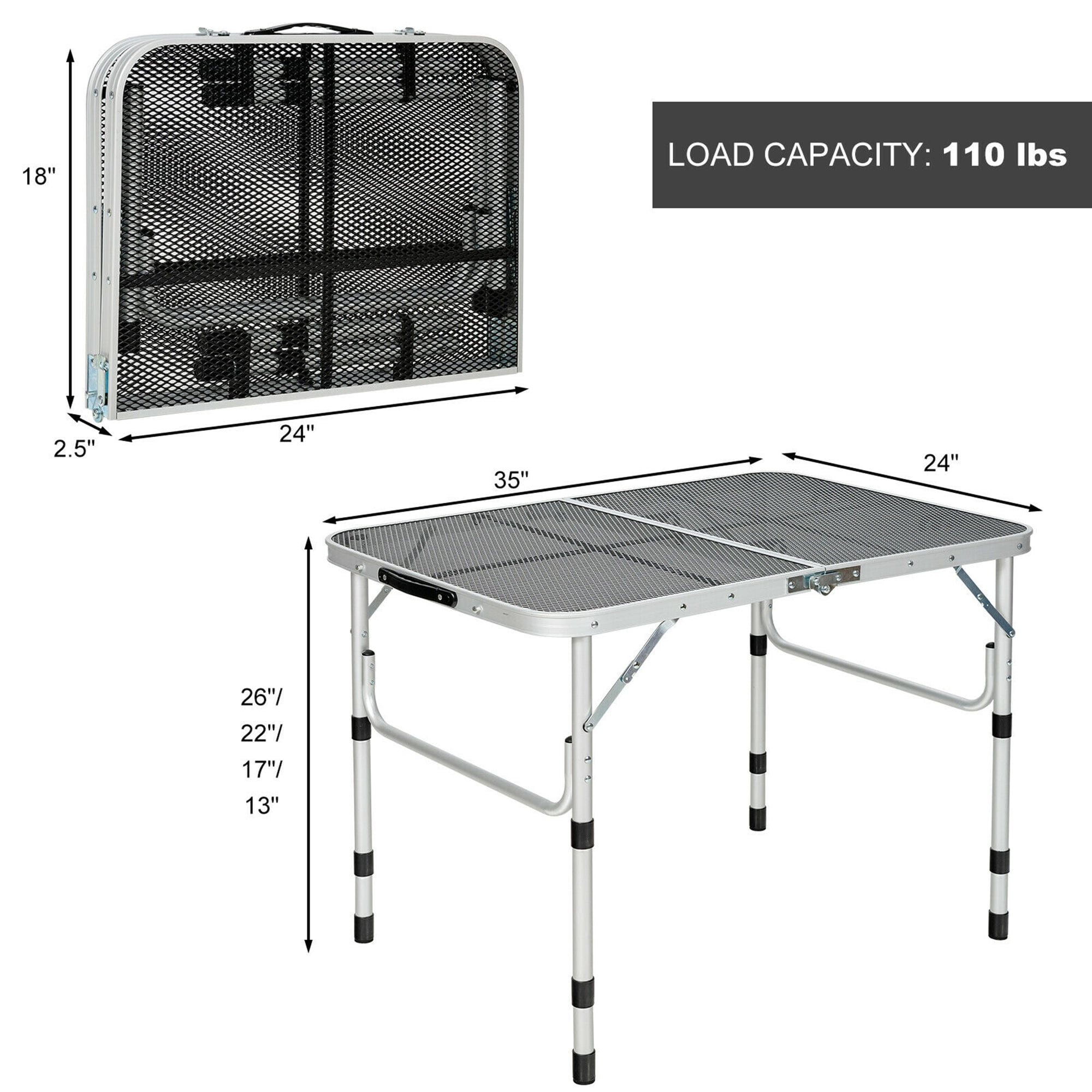 Large Iron Mesh Tabletop:Compared with other brands, our table stands out with its mesh top design, which showcase its great performance in heat dissipation. Made of premium iron, the tabletop is durable and sturdy for better support and long-term use. Besides, the tabletop measures 35” x 24”, offering enough space to hold all requirements. 4 Adjustable Heights:The camping table comes with 2 detachable leg tubes for you to decide the table height as needed. And the extra leg tubes can be used separately or conjunctively to achieve 4 different heights. Whether sitting or standing, you can set the most comfortable using height. Folding Lightweight Design for Easy Carrying: This picnic dining table can be easily folded into a portable size of a small briefcase, which saves storage space when the table is not in use. Thanks to the side carrying handle and lightweight size, you can take it anywhere at will. Also, the easy assembly and disassembly need less time and energy. Selected Material & Sturdy Construction: The folding table is carefully crafted by aluminum and iron with exquisite workmanship, ensuring great durability and high load capacity of 110 lbs. Enhanced metal bars and reinforced connections promote its sturdiness and stability. And bottom anti-skid foot pads help to keep steady on uneven grounds. Versatile Use on Multiple Occasions: This multifunctional table is perfect for both indoor and outdoor use. You can use it as a grill table for family BBQ and get-together parties in backyard and balcony. Also, you can take it to the beach, forest park, fishing place and campsite to enjoy happy camping time. Convenient carrying handle and lightweight design for portability Can be folded to the briefcase size for space-saving storage Perfect for indoor and outdoor use in BBQ, picnic & parties Aluminum and iron materials ensures lasting durability 4 different table heights meet your different needs