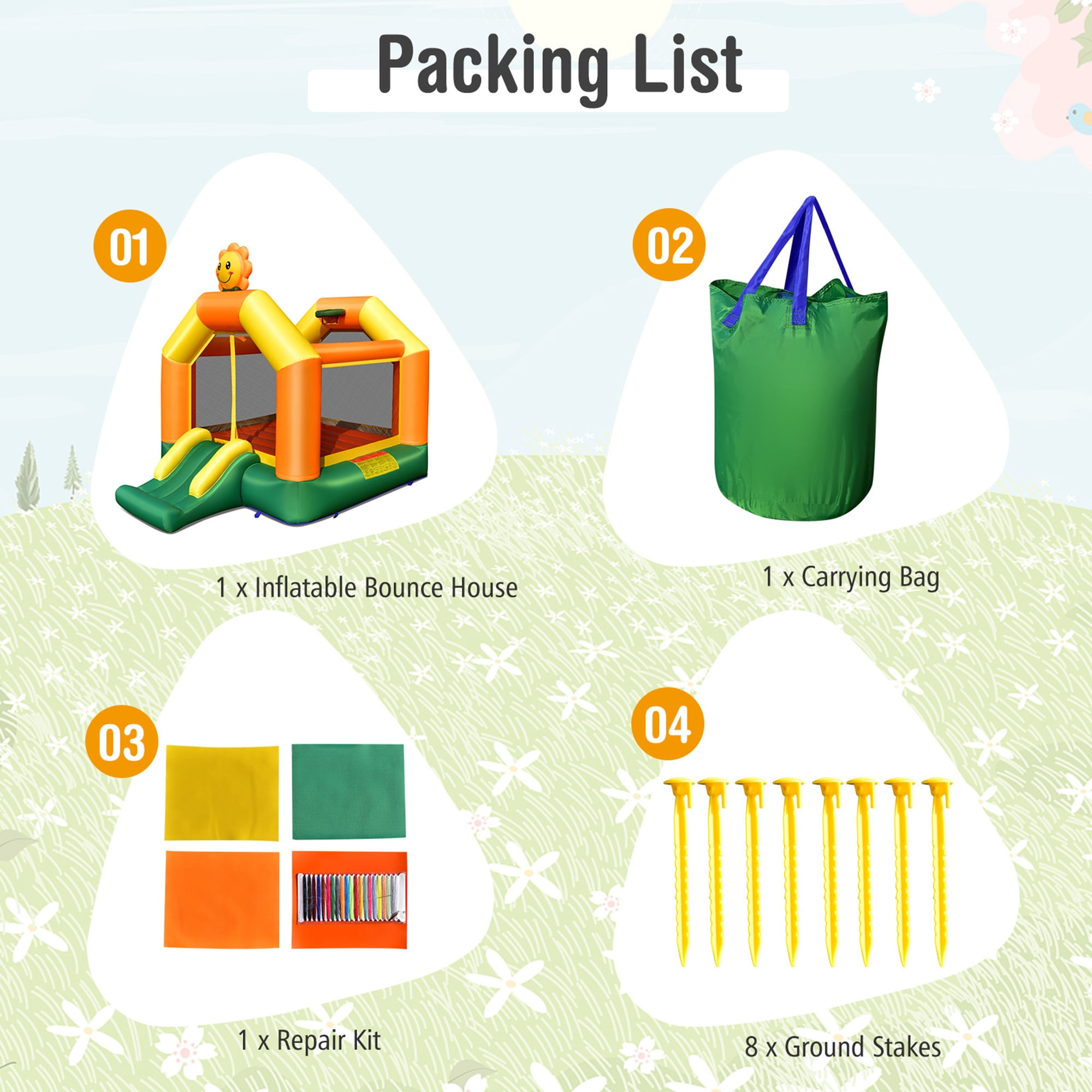 High Quality & Durable Material: Made of wear-resistant and waterproof oxford cloth, our inflatable bounce house ensures great durability and high strength for long-term use. Besides, comes with tight sewing and laminated PVC jump surface, it can easily fit 3 kids aged 3-10 years old to play together. (Suggestion: the weight of each kid should be under 100 lbs) Various Playing Areas: Combined large jumping area with curved slide, the inflatable bounce house provides endless hours of fun for kids. Moreover, the basketball hoop allows your kids to explore sports enjoyment. The bounce house can strengthen physical fitness and keep them away from electric games. Quick Inflation & Easy Storage: The bounce house is easy to set up in a short time. After use, it can be quickly deflated through a long air outlet pipe when stop blowing and then put it in the carrying bag for easy storage and transportation. Recommended for use with 480W-735W air blower (not included), and it is normal that some air coming from the fabric surface and seams. Perfect Gift for Kids: Designed with lovely sunflower pattern and bright colors, the inflatable bounce house is an ideal gift for your kids and brings more happiness to their childhood. Besides, it can be used for indoor and outdoor occasions, such as backyard, lawn, amusement park, etc. Safety Protection & Practical Accessories: Considering the safety of kids, the playhouse features all-round mesh netting wall to avoid accidental injuries and achieve maximum ventilation. The ground stakes make an instant upgrade in stability. The package includes repair kit and carrying bag for convenient use. Unique sunflower design adds much more fun to kids Ideal for indoor, backyard, lawn, amusement park, etc Quick inflation and deflation in a short time Mesh wall ensures security and better air circulation Comes with practical accessories for convenient use Ground stakes for securing the bounce house Carrying bag for easy storage and transportation