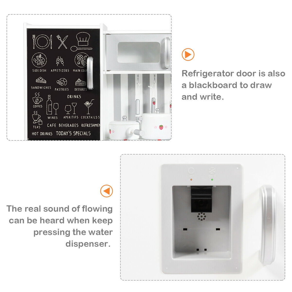 Roomy storage space, open shelves & enclosed cabinets Removable sink with turnable tap easy for kid to clear out little dirt Realistic stove burner with lights & sounds, experiencing the real cooking time Complete realistic cooking set, refrigerator with blackboard, sink, stove, water dispenser, etc. Breathable holes at the back protect children from being suffocated Explicit installation guide & complete hardware, helping you easily set up the set Perfect educational gift for children, in Christmas or on birthdays