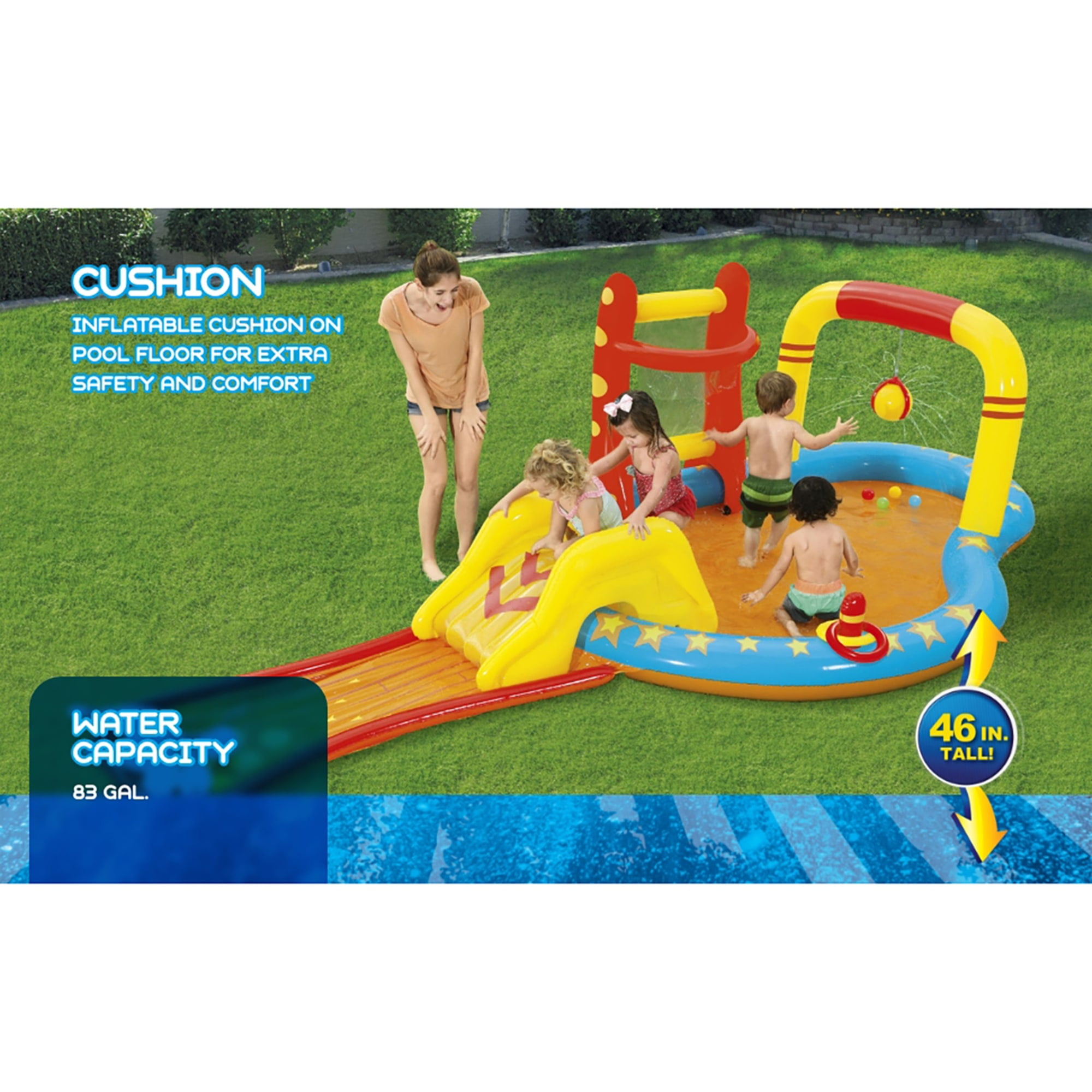 Designed to get kids moving, grooving and out of the house, the H2OGO!® Lil’ Champ Play Center by Bestway is quality-tested and puts the focus back on fun! This play center has it all for a fun day of sports! Bowling, basketball, tether ball and a fun ring toss turn this play center into a mini-waterpark that will keep your kids having fun and keeping score while they play the day away. Also included is a removable slide that can be tied down with tie ropes and grommets. The multicolor Play Center comes with 6 bowling pins, 2 inflatable rings, and 4 play balls. The inflatable cushion on the pool floor provides extra comfort for any child. The water sprayer attaches to your garden hose, keeping your kids cool during the hot summer months! With enough room for friends, splashing in the sun has never been more fun than with the H2OGO! Lil’ Champ Play Center! Weight capacity is 198 pounds. Suitable for ages 2 years and up.