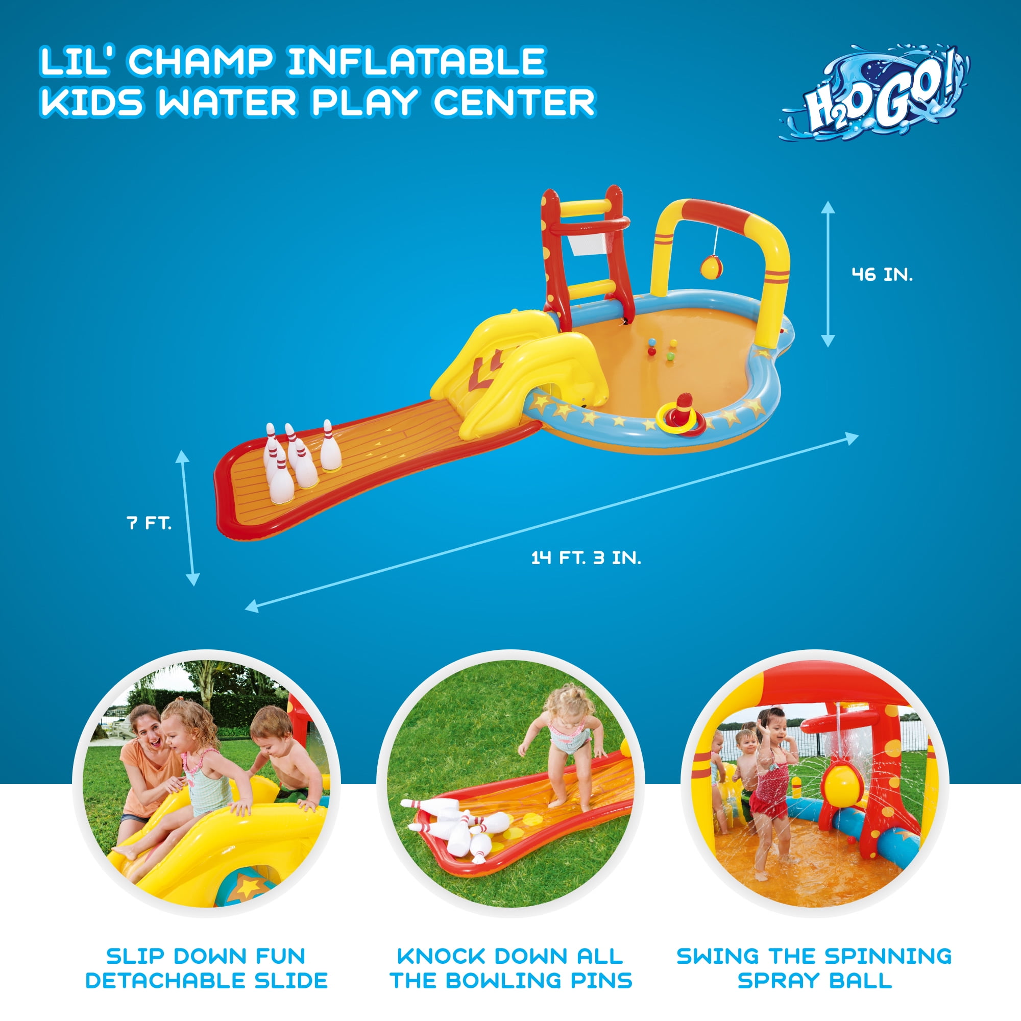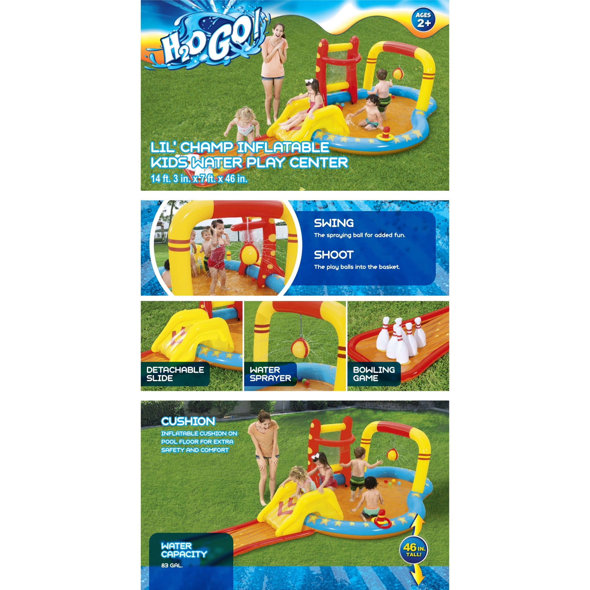 H2OGO! Lil’ Champ Outdoor Play Pool Center, Ages 2+ Fun detachable slide Water sprayer easily attaches to a garden hose Swing the spraying ball for summer fun Shoot the play balls into the basket Slide and knock down all the bowling pins Water Capacity: 83 gal. (314 L) Contents: 1 play center, 6 bowling pins, 1 basketball stand, 2 inflatable rings, 4 play balls, 1 repair patch Weight capacity: 198 lbs.
