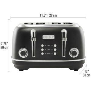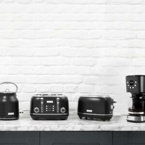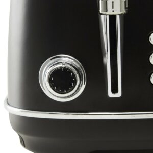 Brighten up your morning routine and upgrade your kitchen counter with the Haden Heritage 4 Slice Black & Chrome Toaster. This retro-chic product features multiple settings to ensure that your toasts or bagels are browned exactly to your liking, this product has a cancel setting that lets you stop the toasting cycle midway. A self-centering function automatically centers bread for a perfect result. Suitable for the whole family accommodating up to four slices of toast at one time and featuring extra wide slots, this impressive unit can toast a range of breakfast foods, including thick cut bread, bagels, buns, crumpets, and more. Match it up with the Haden Heritage Black & Chrome Kettle to get an incredible and elegant set that will create the wow factor in your kitchen.