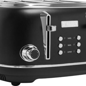 – Features: Four Slice Toaster with Extra Wide Slots for Bagels, Painted Stainless Steel Housing with Haden Badge, Self-Centering Function, and Removable Crumb Tray