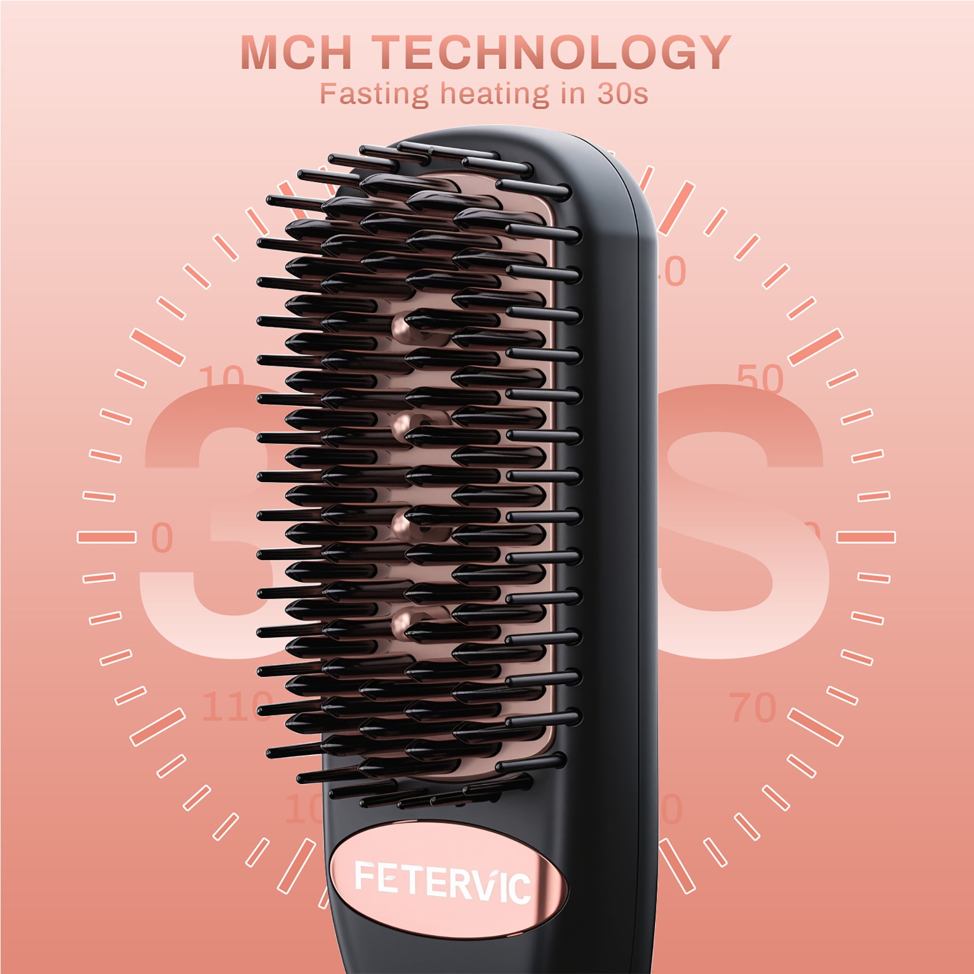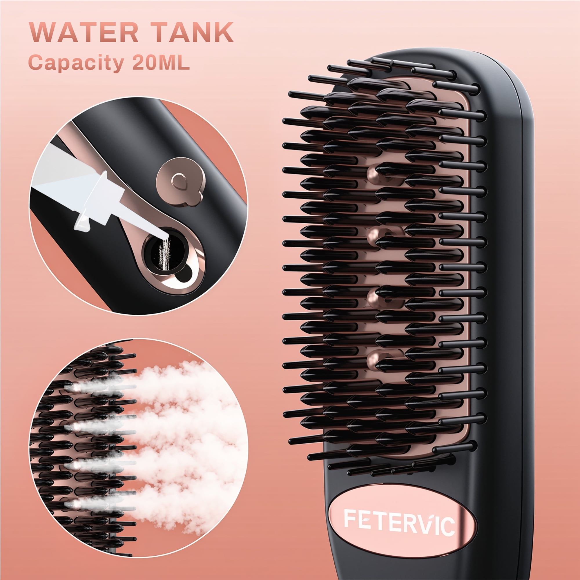 【Advanced Negative Ion Technology for Sleek, Smooth Hair】The FETERVIC Steam Hair Straightener Brush is equipped with innovative negative ion technology, emitting 2 million negative ions to reduce frizz, static, and flyaways. This feature locks in moisture, adds shine, and ensures your hair stays sleek, smooth, and healthy. Perfect for achieving salon-quality results at home, it maintains natural volume and softness while enhancing your hair’s appearance. 【Steam-Infused Design for Deep Hair Repair】The unique steam design of the FETERVIC Hair Straightener Brush opens the hair cuticles, allowing moisture and nutrients to deeply penetrate, repairing dry, frizzy, and damaged hair. The steam function also enhances shine and softness, providing your hair with a revitalizing steam treatment as you style, resulting in a healthier, more polished look. 【Rapid Heating for Instant Straightening】 Featuring PTC technology, this hair straightener brush heats up in just 30 seconds, ensuring fast and even heat distribution. Save time and energy costs while quickly transforming frizzy, unruly hair into smooth, straight styles. This straightening brush is ideal for those seeking efficient, everyday styling with professional results. 【Adjustable Temperature & Safety Features】Tailor your styling experience with 13 adjustable temperature settings, ranging from 210-430℉ (100-220℃), displayed on an easy-to-read LED screen. This versatility makes the FETERVIC Hair Straightener Brush suitable for all hair types, from fragile to coarse. Safety is paramount, with features such as an automatic shut-off after 60 minutes, a 360° swivel cord for tangle-free styling, and anti-static and anti-scald properties to ensure a secure and user-friendly experience. 【MCH Heating & Memory Mode for Convenience MCH】Equipped with two MCH ceramic heating units, the brush provides faster, more precise temperature control, reaching up to 430°F for quick and effective styling. The memory mode recalls your preferred heat setting, making it easy to get smooth, frizz-free results in minutes, perfect for busy mornings or last-minute touch-ups. 【How to use Steam】After cutting off the power supply, open the water tank cover, and fill it with a 20ml vial (hint: Inject pure water, which can extend the service life of the product), and the water tank capacity is about 20ml. After filling water, cover the water tank, wipe the residual water stains on the surface, and keep the hands dry before using the power.Press the steam button drop l sound, the steam room starts to work, about 30 seconds to automatically release steam.