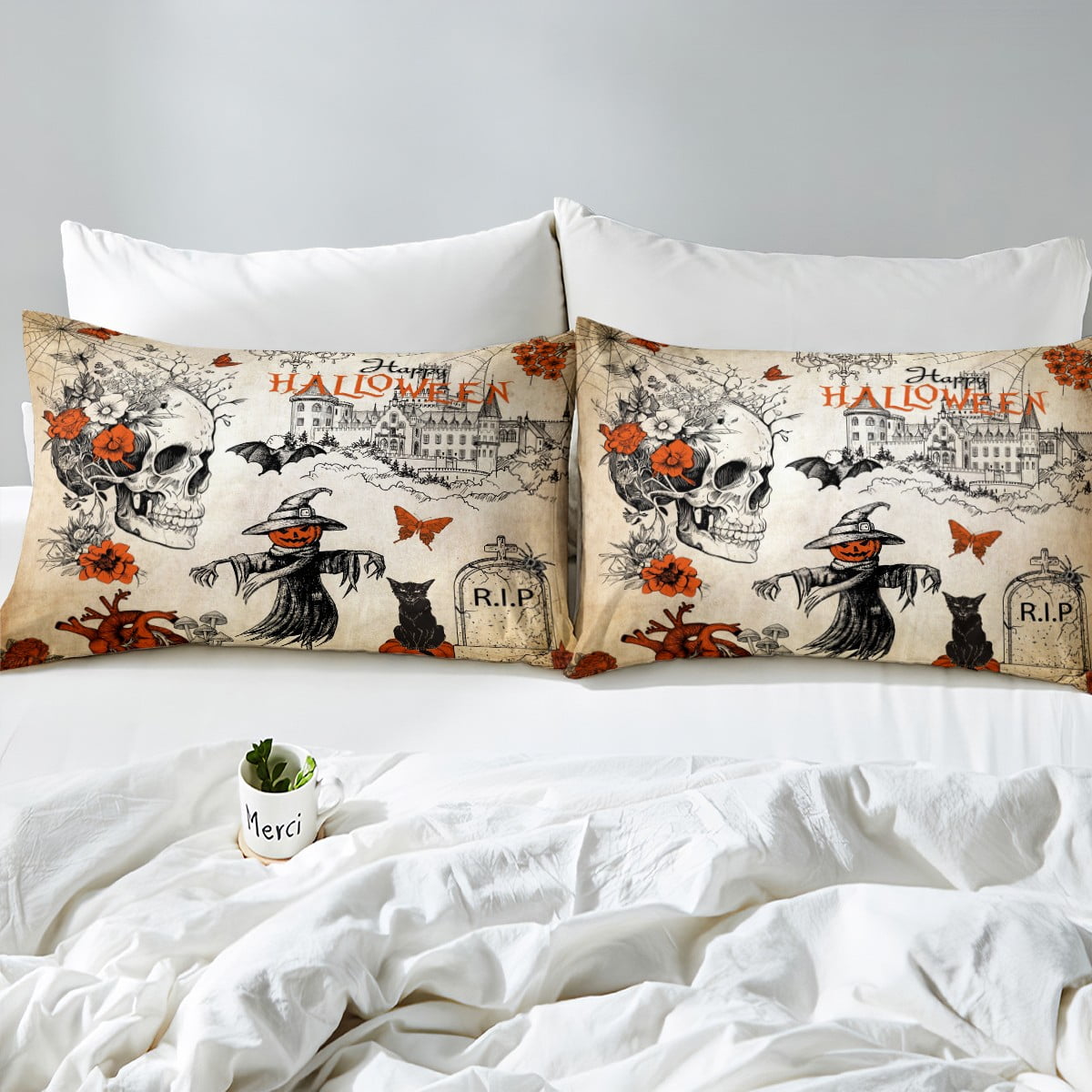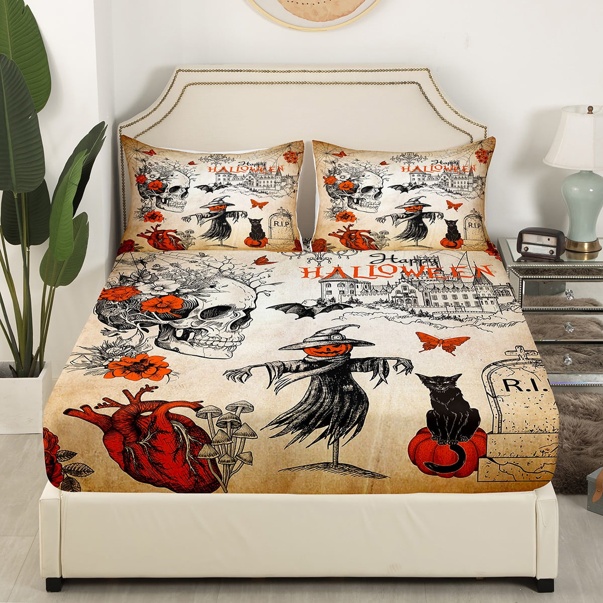 Halloween Sheets Skeleton Skulls Black Cat Decor Bed Sheets Set Halloween Castle Pumpkin Scarecrow Sheet Set Flowers Butterfly Bat Gothic Decor Bedding Set With 2 Pillowcases, Queen