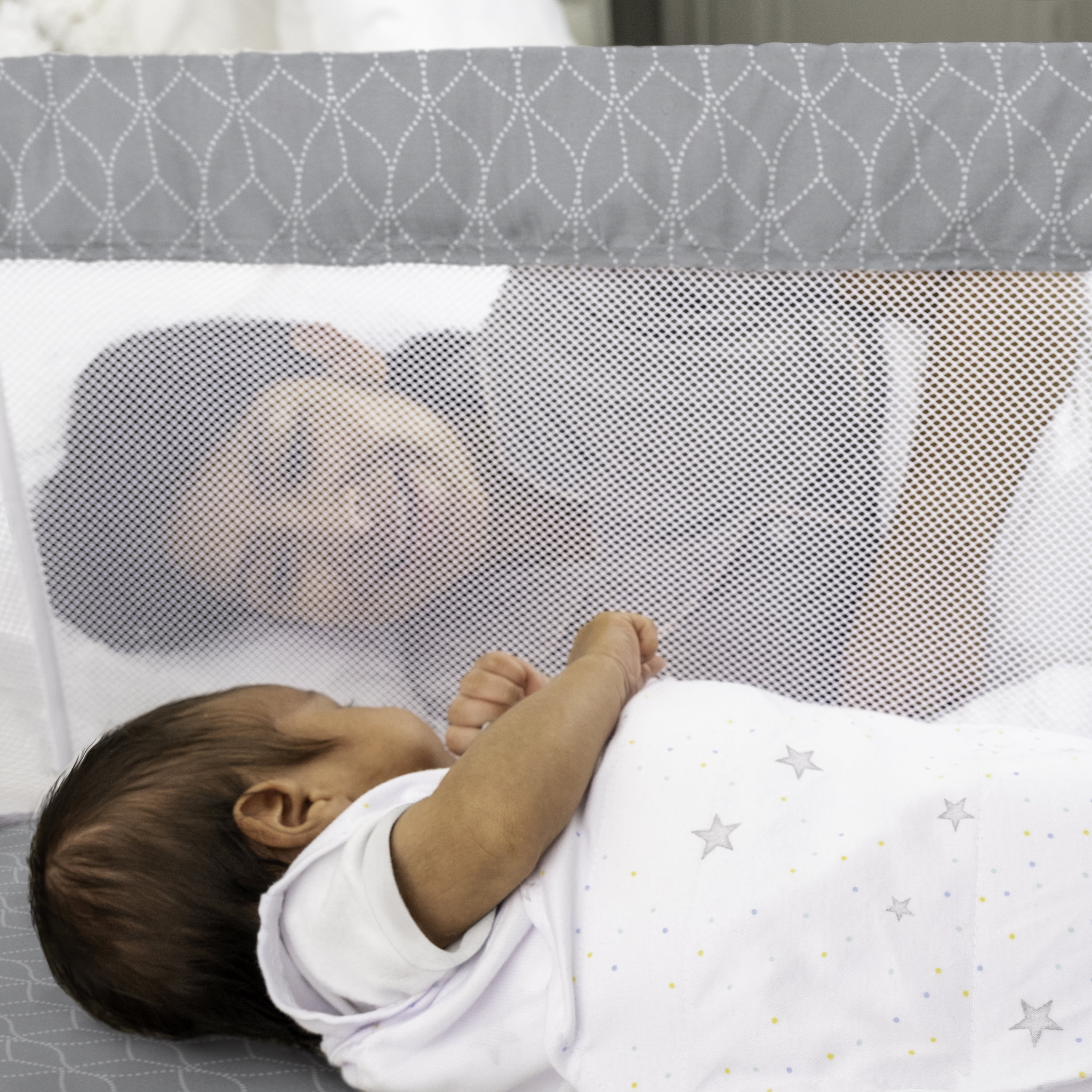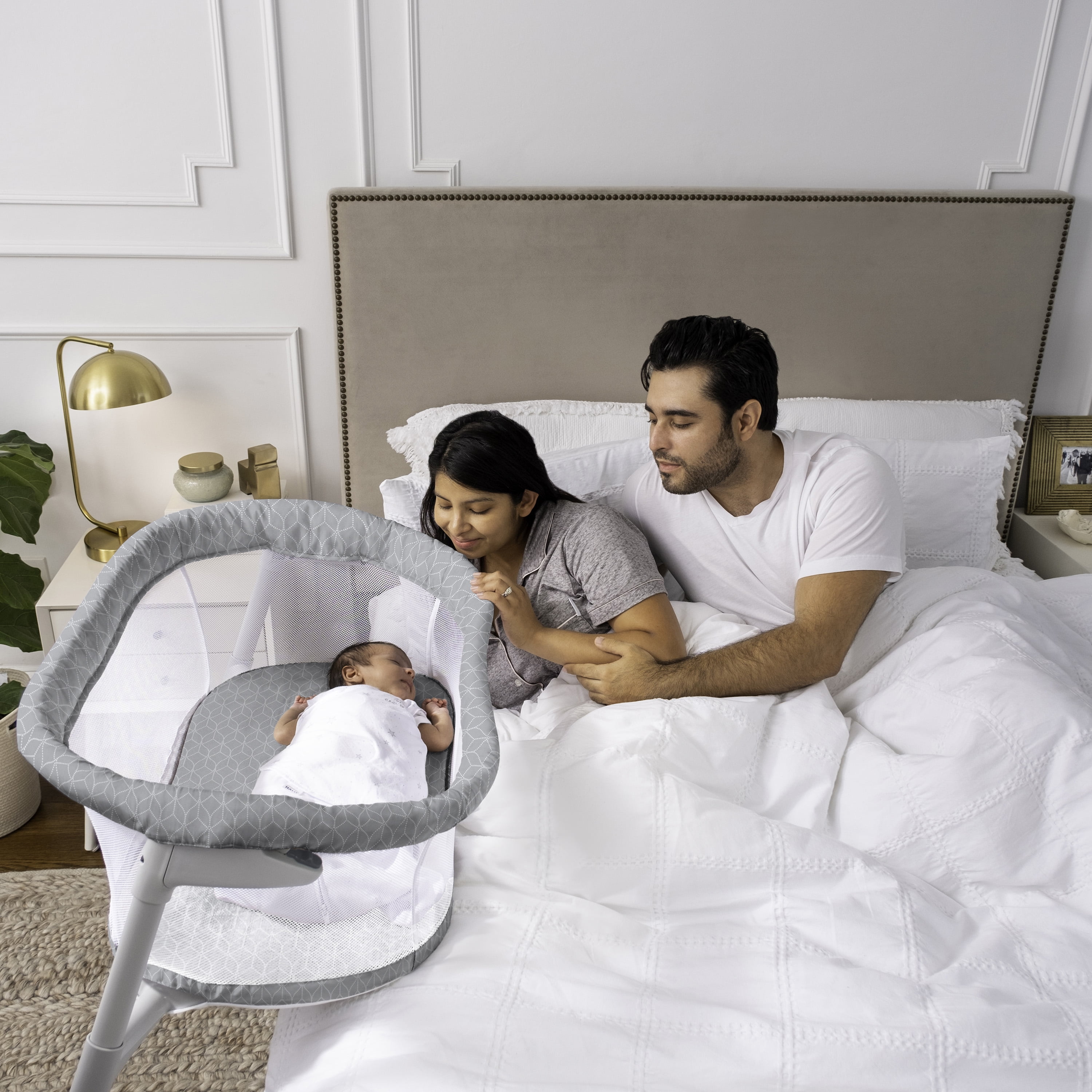 Sleep safely next to your infant baby without bedsharing Flat bed surface adjusts to fit over your bed for extra close sleep HALO’s signature lowering wall for easy access without bending or twisting Lightweight to easily move around the house