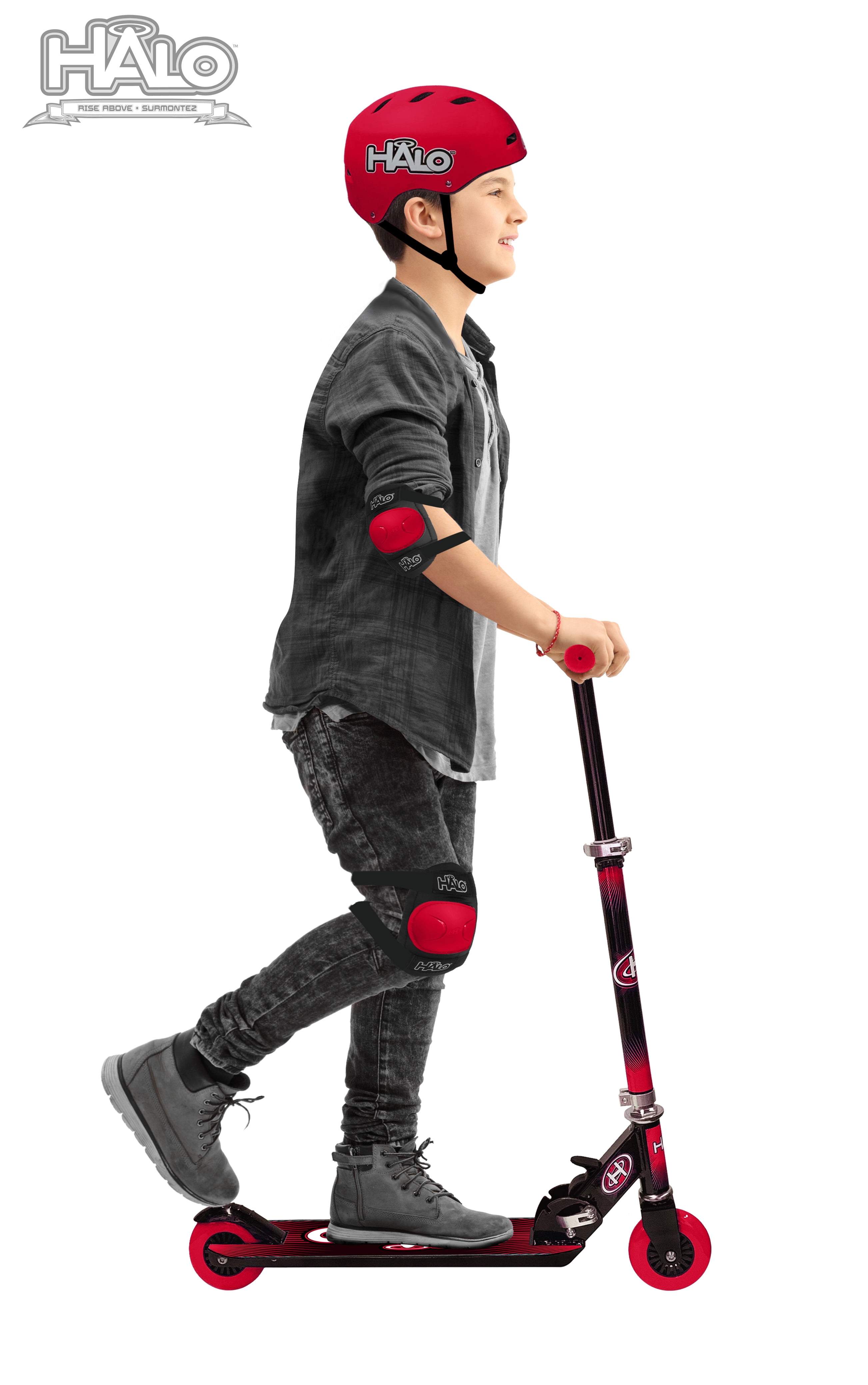 HALO Scooter Combo Set Includes a HALO Kick Scooter, Multi-Sport Helmet with Adjustable Head Ring and Protective Knee and Elbow Pads! Scooter is equipped with 100mm long-lasting polyurethane wheels with high precision ABEC-5 bearings. Height adjustable settings for handle bars allow riders of all sizes to have a perfect setup. Rubber handles provides the ultimate comfort. Rear wheel footbrake for total control!
