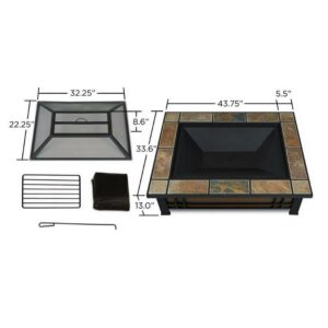 Includes spark screen, log poker tool, log grate and protective storage cover. Requires phillips screwdriver for assembly. Burns seasoned firewood. Heat resistant powder coated steel frame. Extra-long base. Brown base surrounded by black, mission-styled frame with natural-colored slate top. Center burn pan is removable for cleaning. Cover when not in use. ISTA 3A certified. Warranty: 90 days limited. Made from heat resistant powder-coated steel and natural slate tile. Made in China. 43.75 in. W x 33.6 in. D x 13 in. H (85 lbs.). Assembly Instructions. fire pit