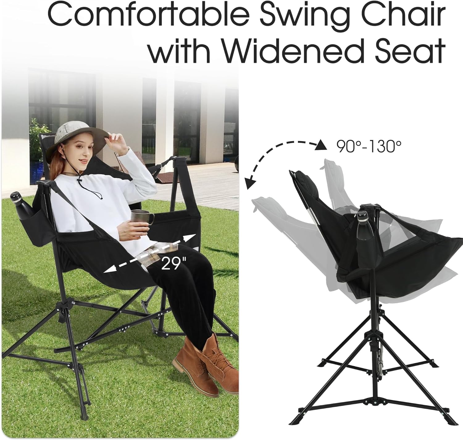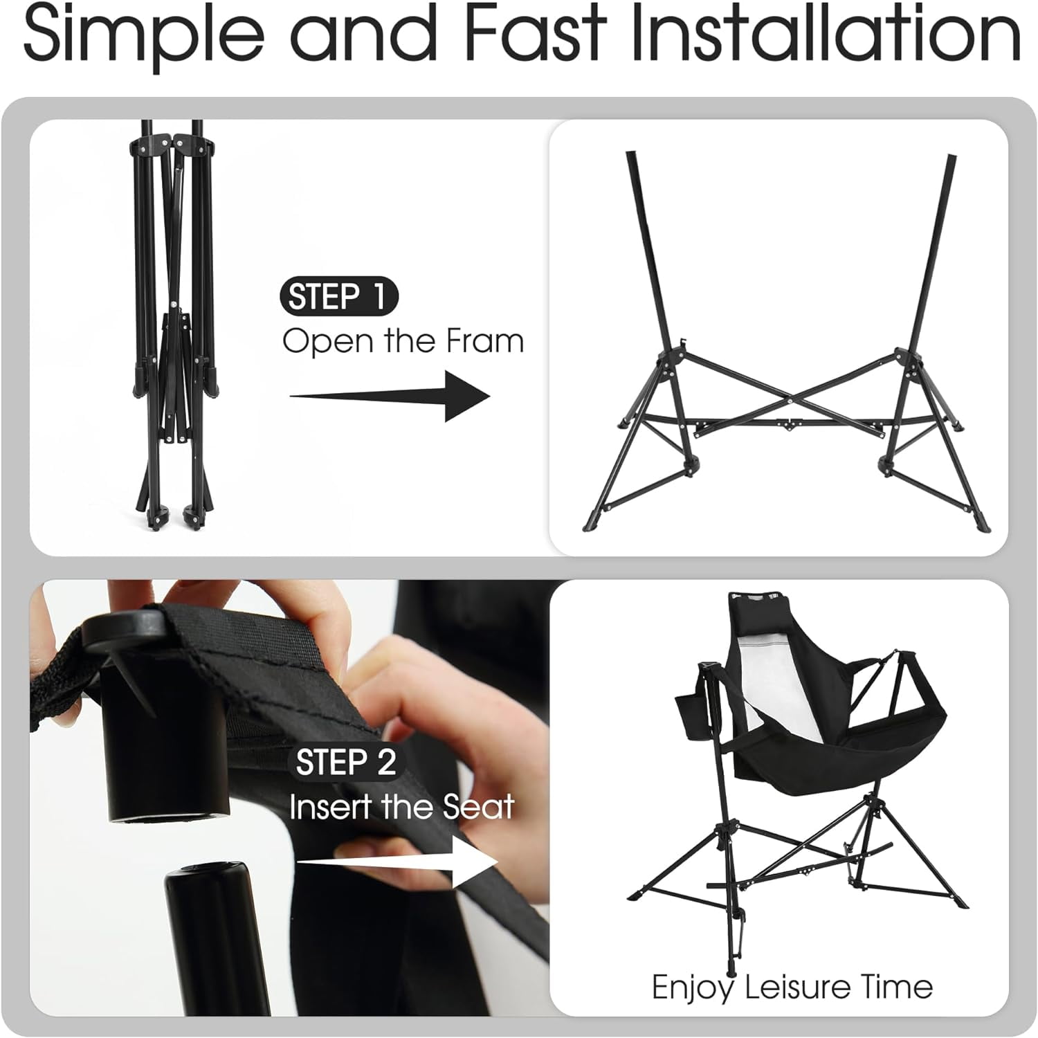 This oversized seat and high back features a PVC polyester fabric, durable, wear-resistant, and weather-resistant for maximum comfort. The breathable fabric allows air to circulate for comfortable sitting experience and also lets you lie to relax and doze off The folding and lightweight size does not occupy storage space for easy storage and is easy to be carried outdoors. With a folding design, you can fold the camping chair up to a compact size within seconds. The lightweight design allows you to move wherever you want Constructed with sturdy steel, this folding hammock chair is stable and solid enough to support up to 300lbs. Auto lock when fully open also ensures the stability and safety