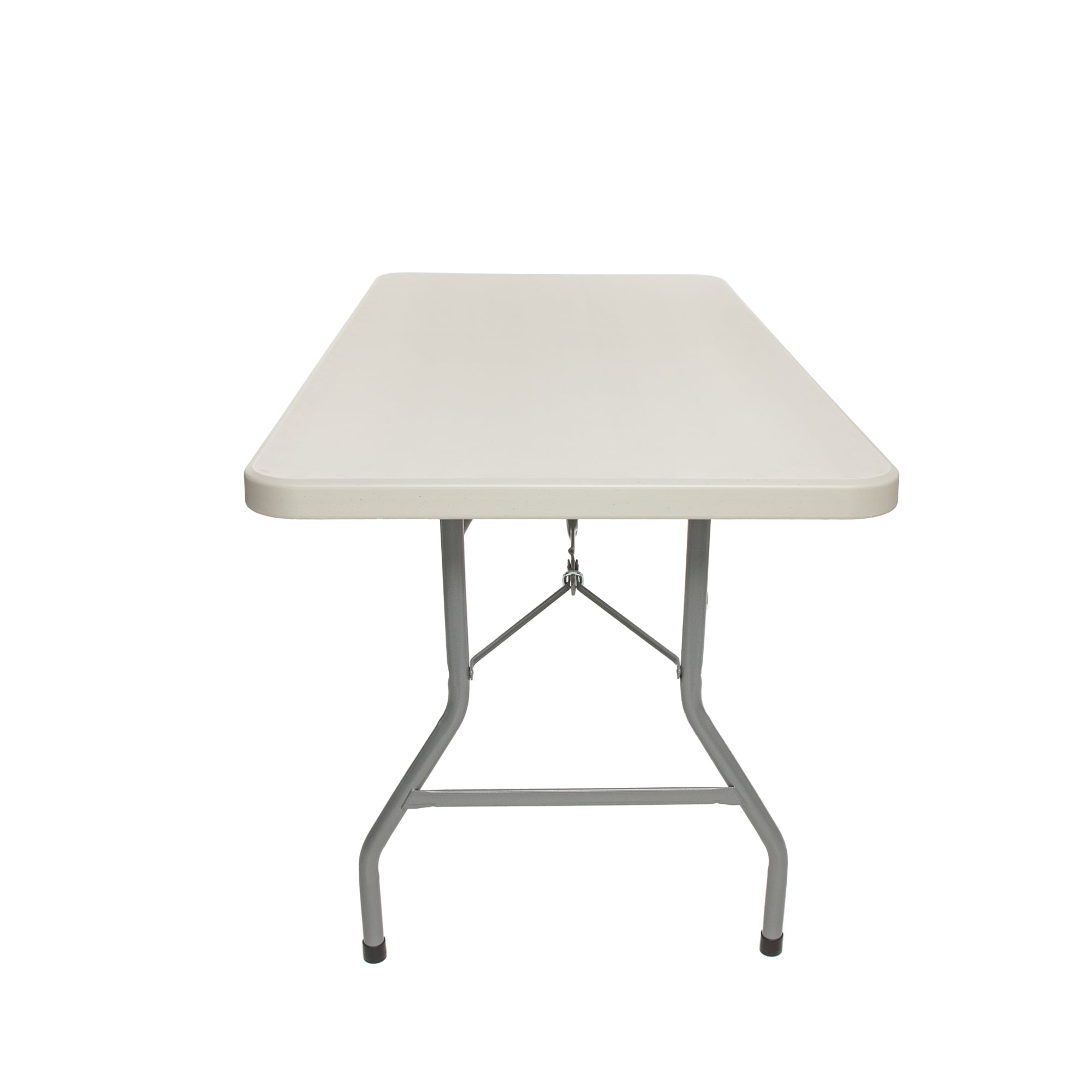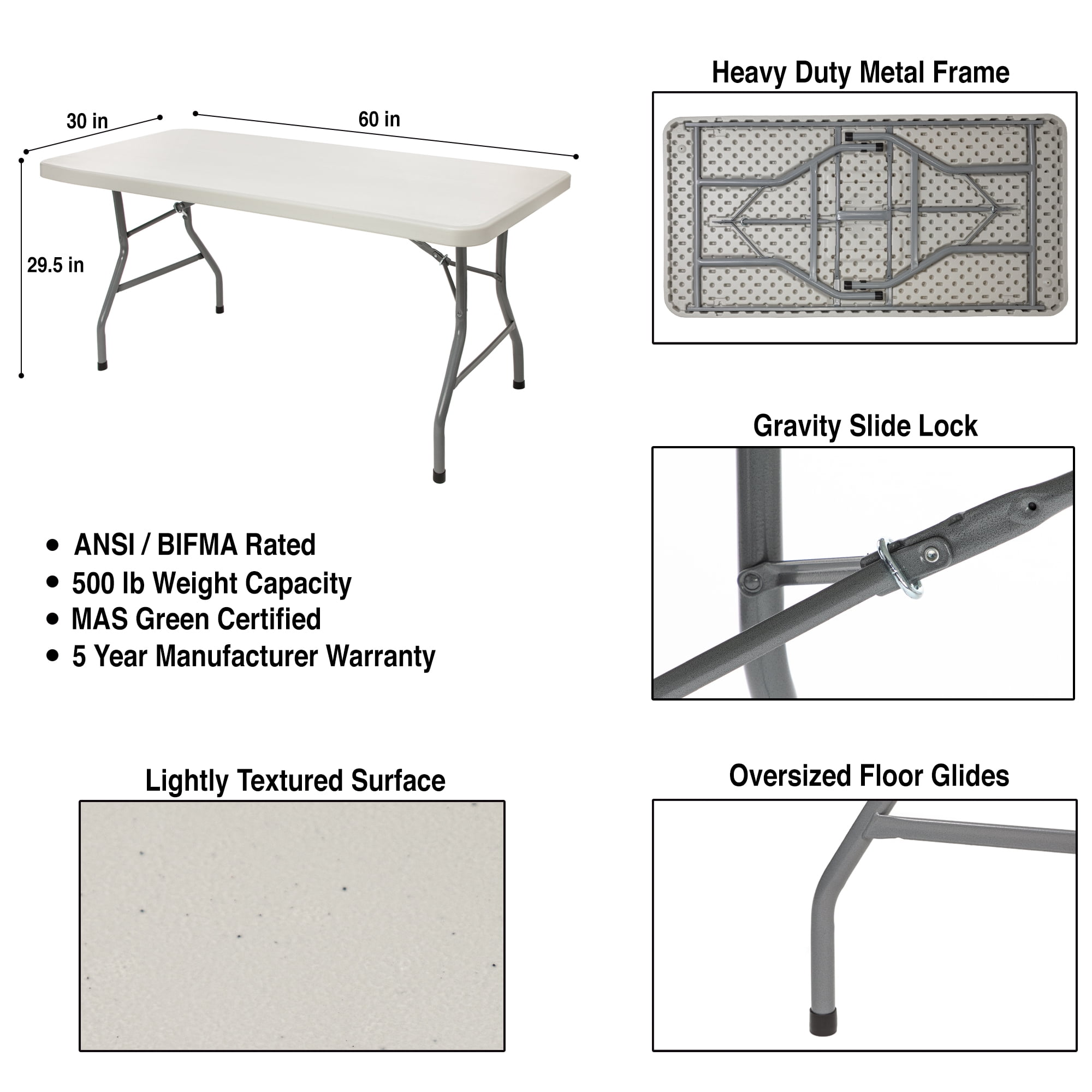 Sturdily constructed with 17 gauge steel, 1.75 inch thick blow molded plastic. 1000 lb weight capacity Lightweight, wishbone-style legs and gravity slide locks to maintain overall strength and support Scratch-resistant top