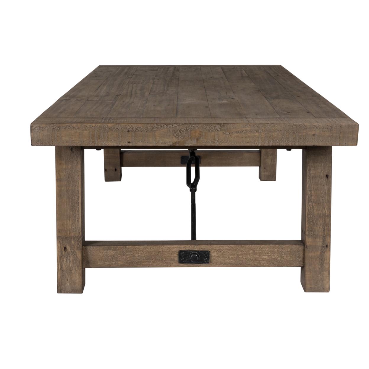 Handcrafted Reclaimed Wood Coffee Table with Grains, Weathered Gray- Saltoro Sherpi Accentuate your living space with the addition of this handcrafted transitional style coffee table, featuring wood grain details and knots. Constructed sturdily from reclaimed pinewood it is accented with weathered gray finish. Supported on sturdy base with metal turnbuckle, its wide top can be used to keep books and magazines. Enjoy your evening coffee on this coveted coffee table and at the same provide a ravishing touch to your existing decor. Specifications: A single piece of transitional style coffee table with weight capacity of 176 lbs. Supported on sturdy base with metal turnbuckle, it features grain details and knots. Constructed sturdily from reclaimed pinewood, it is accented in the hue of weathered gray. Overall Dimensions: 30 inches in Length x 55 inches in Width x 18 inches in Height Place it in your living space besides your sofa to comfortably enjoy your coffee.