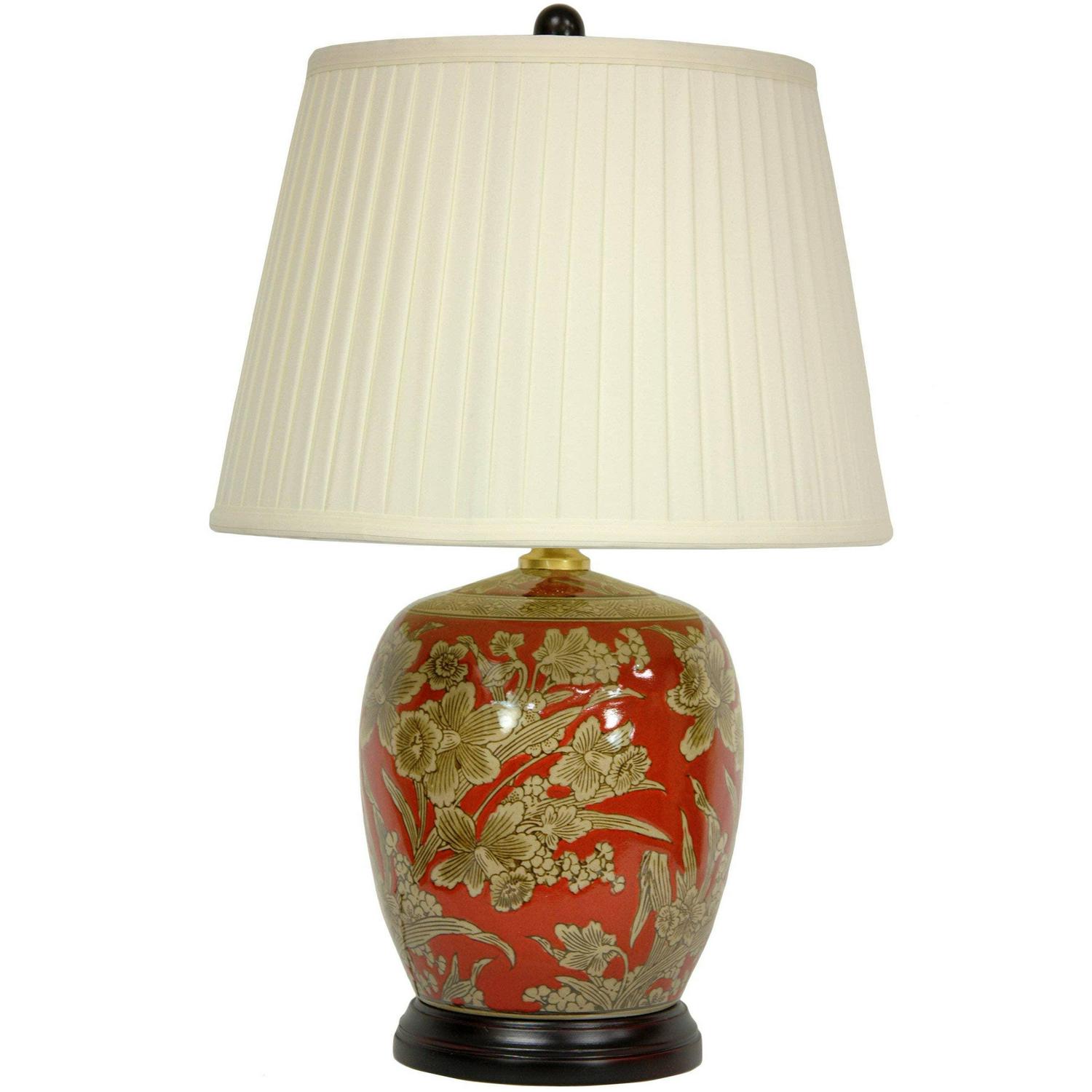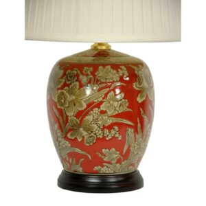 Melon jar shaped porcelain ceramic lamp in a rich red color with an intricate floral pattern in beige and brown. Lamp is mounted on a round rosewood base and ships with a pleated white lamp shade and decorative finial. UL approved hardware uses standard U.S. light bulbs, either fluorescent or incandescent.