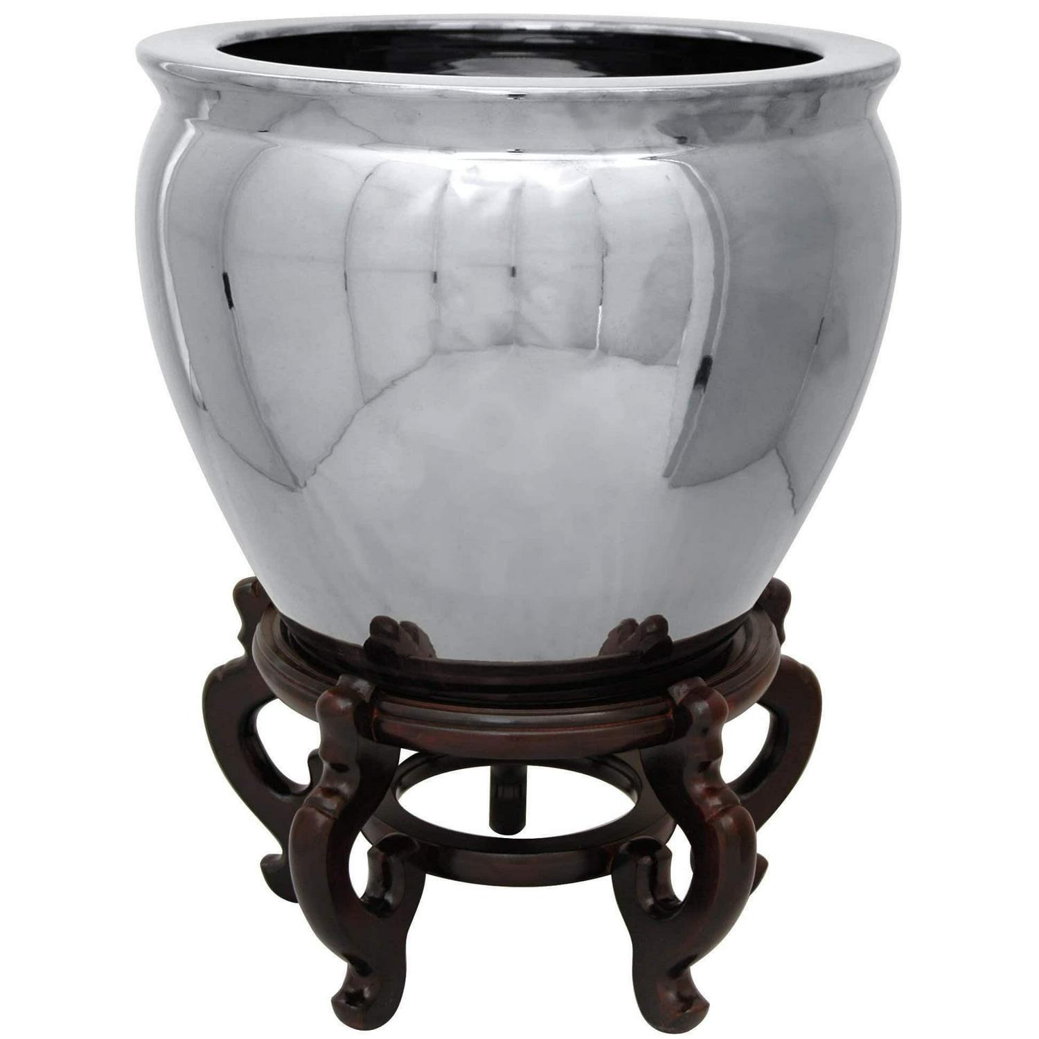 This small porcelain fishbowl has been hig-temperature fired, the heavy Chinese porcelain finished in a distinctive high gloss metallic silver glaze. Basic design and bold finish adapts to both traditional Asian decor or modern, more minimalist interiors. Display a pair as matched planters or individually as a decorative accent.