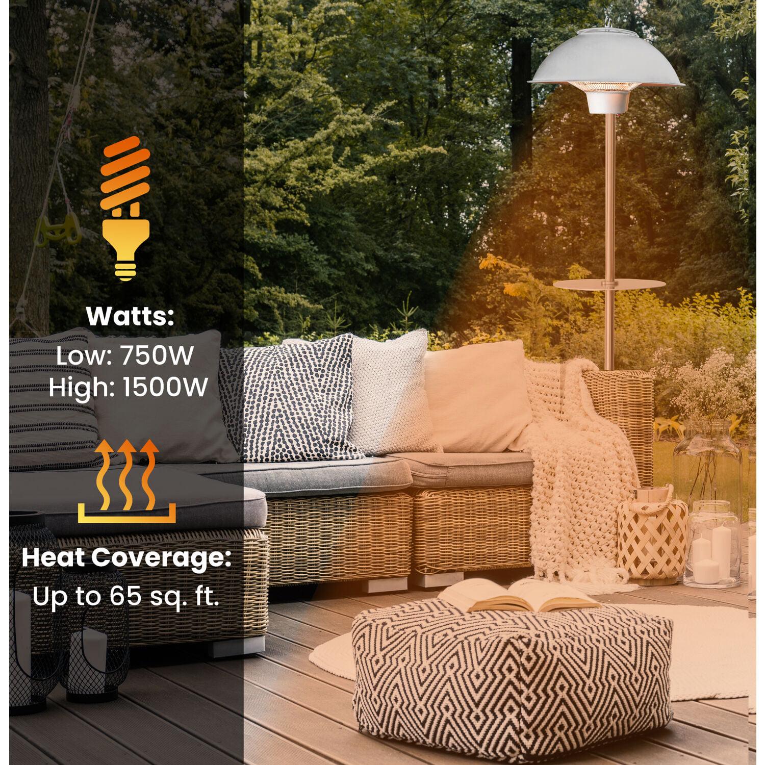 – POWERFUL EFFICIENT HEAT: Use one of it’s 3 power settings to transmit heat up to a 56 sq foot radius, perfect to keep your guests comfortable on your deck, patio, porch or balcony. Three power settings are Low 500W, Medium 1000W,High 1500W.