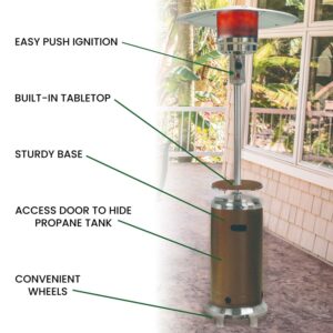 – PORTABLE CASTER WHEELS: Move this heater in and out of storage easily by using the two caster wheels on the base of the unit. With easy mobility, this portable outdoor heater can provide warmth multiple areas.