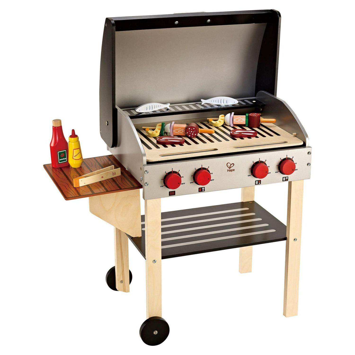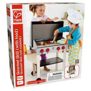 HAPE GOURMET GRILL & ACCESSORIES -22 PIECES – Double-sided grates, a collapsible side table, moveable wheels and an open-and-close hood make this grill a gourmet’s dream. Watch out for the hot coals! Everyone loves a good barbecue! With the Playfully Delicious Gourmet BBQ Grill Set from Hape, children can host their own barbecue with tasty food and tons of fun. This innovatively designed play set features a hooded BBQ grill with electric burners, a collapsible side table, and double-sided grates that slide out to reveal hot coals. Also included is the Shish Kabob Play Food Set with two skewers and slices of meat and vegetables, to help little chefs get started with their grilling. Combine with other Hape Playfully Delicious food sets to cook up a mouthwatering BBQ feast for the whole family!