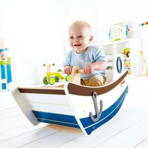 HAPE HIGH SEAS TODDLER ROCKING RIDE-ON – Rocking and riding are foundational to walking. Each phase of movement in a child’s life is essential for developing motor skills. From laying on their back with extended limbs to crawling across the floor, your child is on their way to walking!When kids start climbing and standing, be prepared with Ride-On toys from Hape to help them move into the next developmental stage – balance. Rocking toys emphasize coordination and balance, as well as build arm and leg strength. Kids can gradually gain confidence and understanding of their bodies.Cast off from shore to teeter and totter on the ocean waves! Drift across the deep blue and rock worries away aboard this tugboat. This nautically-inspired teeter-totter is perfect for the little explorer in your life.