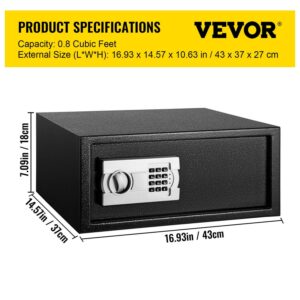 The security box is constructed with high-quality carbon steel, making it sturdy and durable. The money safe box adopts the advanced electronic code lock, featuring excellent sensitivity and pry-resistant bolts. It also comes with two keys for emergency use. This digital lock box is convenient to install and ideal for storing guns, jewelry, cash, important documents, etc. It’s 0.86” dia and 1.4” long solid bolts and concealed door hinges make sure no theft can steal valuables from you;Two unlocking methods are available. You can use the electronic code to unlock the door, and when the battery is out of power, you can use the key to open the safe. The LCD screen shows everything you need, like a low battery, and an error code.The money safe for adults is widely used to store guns, important documents, jewelry, cash, and other valuables. It is perfect for home, hotel, office, shop, restaurant, etc.External Size (LxWxH): 16.93″x14.57″x7.09″/43x37x18 cm;Internal Size (LxWxH): 16.81″x12.17″x6.97″/42.7×30.9×17.7 cmDoor Thickness: 0.12″/3 mm ;Solid Bolt Diameter: 0.86”/22 mm ;Solid Bolt Length: 1.4”/35 mm ;Box Body Thickness: 0.05″/1.2 mm;Capacity: 0.8 Cubic Feet/22.65L
