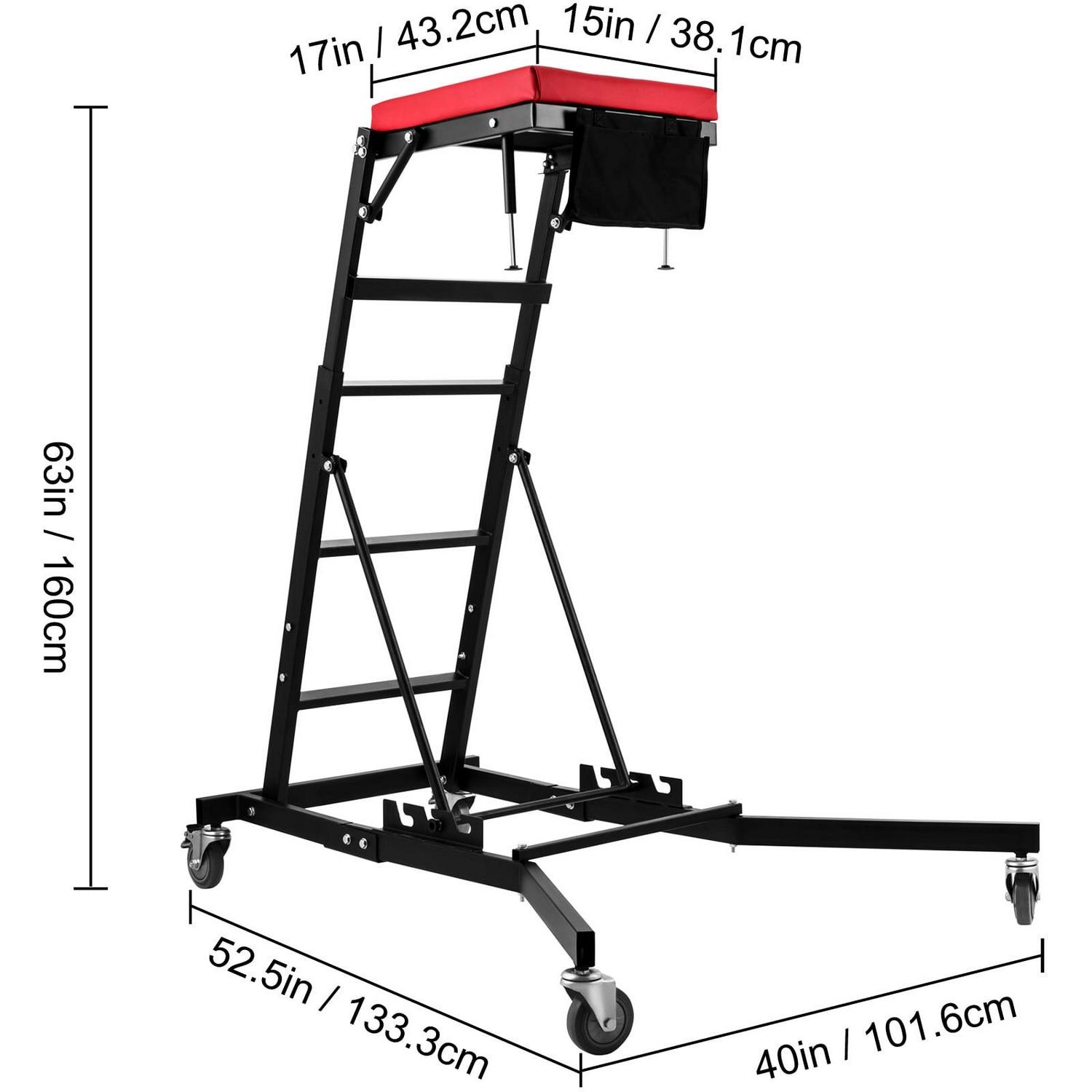 – The thick padded deck provides comfortable support while working atop the creeper. Storage pouch is for storing tools, or small parts, enhancing your working efficiency by keeping the tools close at hand. In addition, two support rods can be extended to create a more stable working deck.