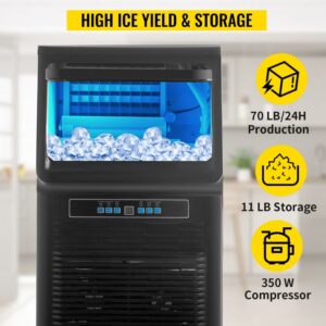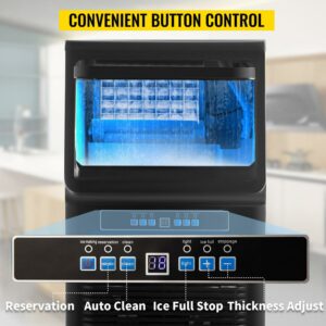 – High efficiency: 350W table ice maker, high efficiency ice making. Ice making capacity 70lbs/24H, ice storage capacity 70lbs, ice tray 30pcs (4×9). Ice thickness adjustable