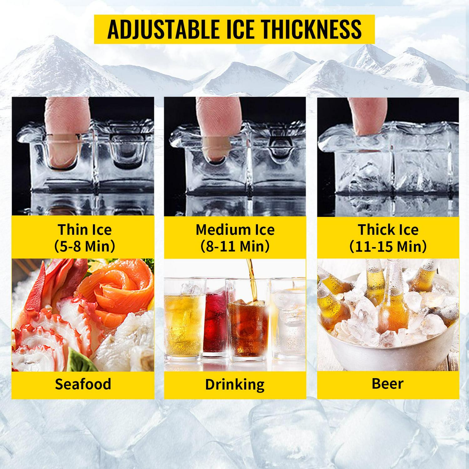 Adjustable Ice Thickness: Crystal ice cubes 0.9″x0.9″x0.9″ (22x22x22 mm). Thin ice cubes (5-8 min) are suitable for decorating & freezing seafood, medium ones (8-11 min) for smoothies, and thick ones (11-15 min) for chilling the beers.