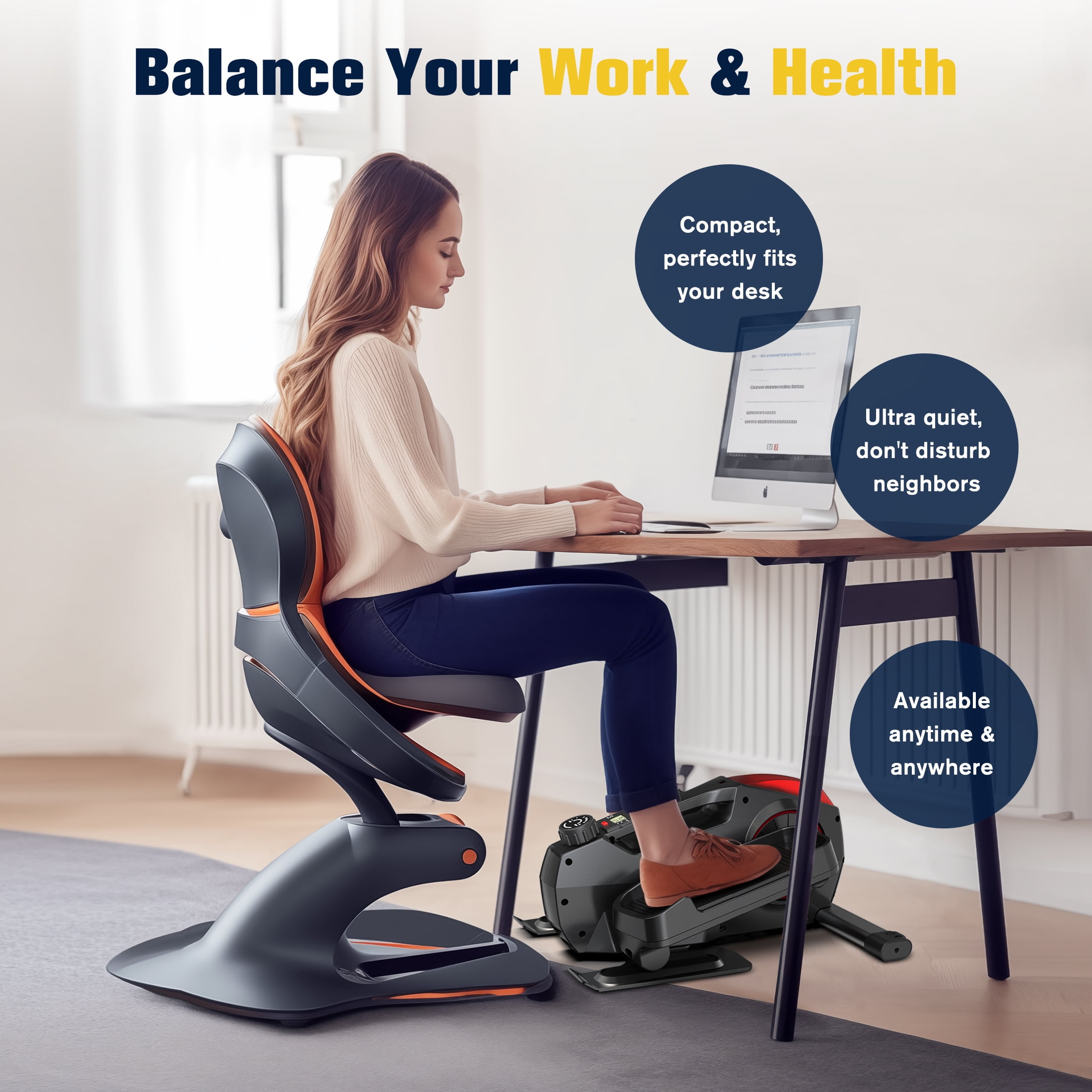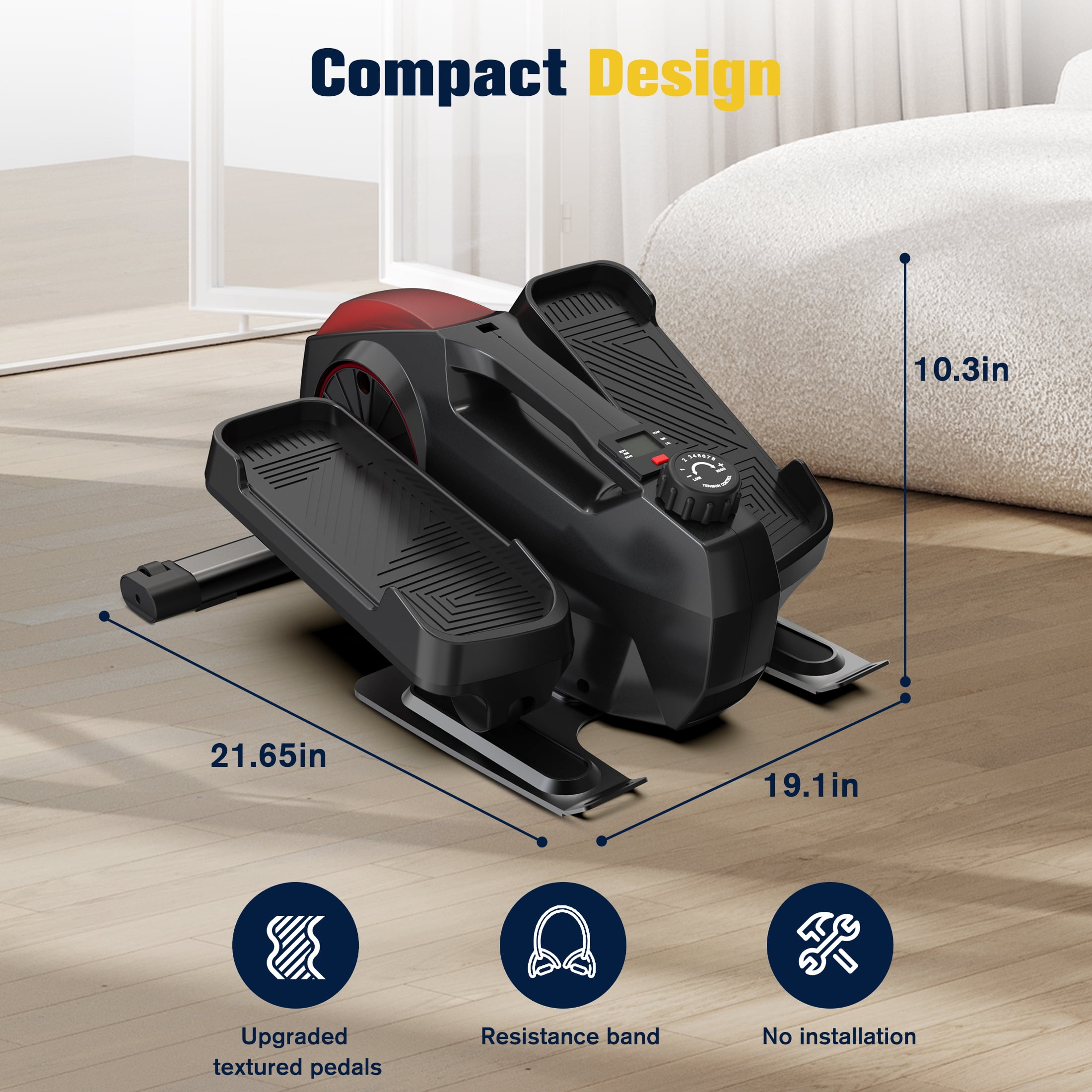 Our under desk elliptical, the easiest fitness equipment for your health and convenience. Achieve optimal fitness with just 75 minutes of weekly aerobic exercise. Customize your workout with 8 resistance levels, from gentle circulation enhancement to calorie-burning intensity. It’s 100% pre-assembled for instant use, and its absolute stability ensures a safe exercise experience, making it perfect for seniors and anyone looking for a secure workout. Product Size: 21.65×19.1×10.3 inch Product weight: 30lbs Package Content: 1× Desk Elliptical 2×Resistance Bands 1× User Manual