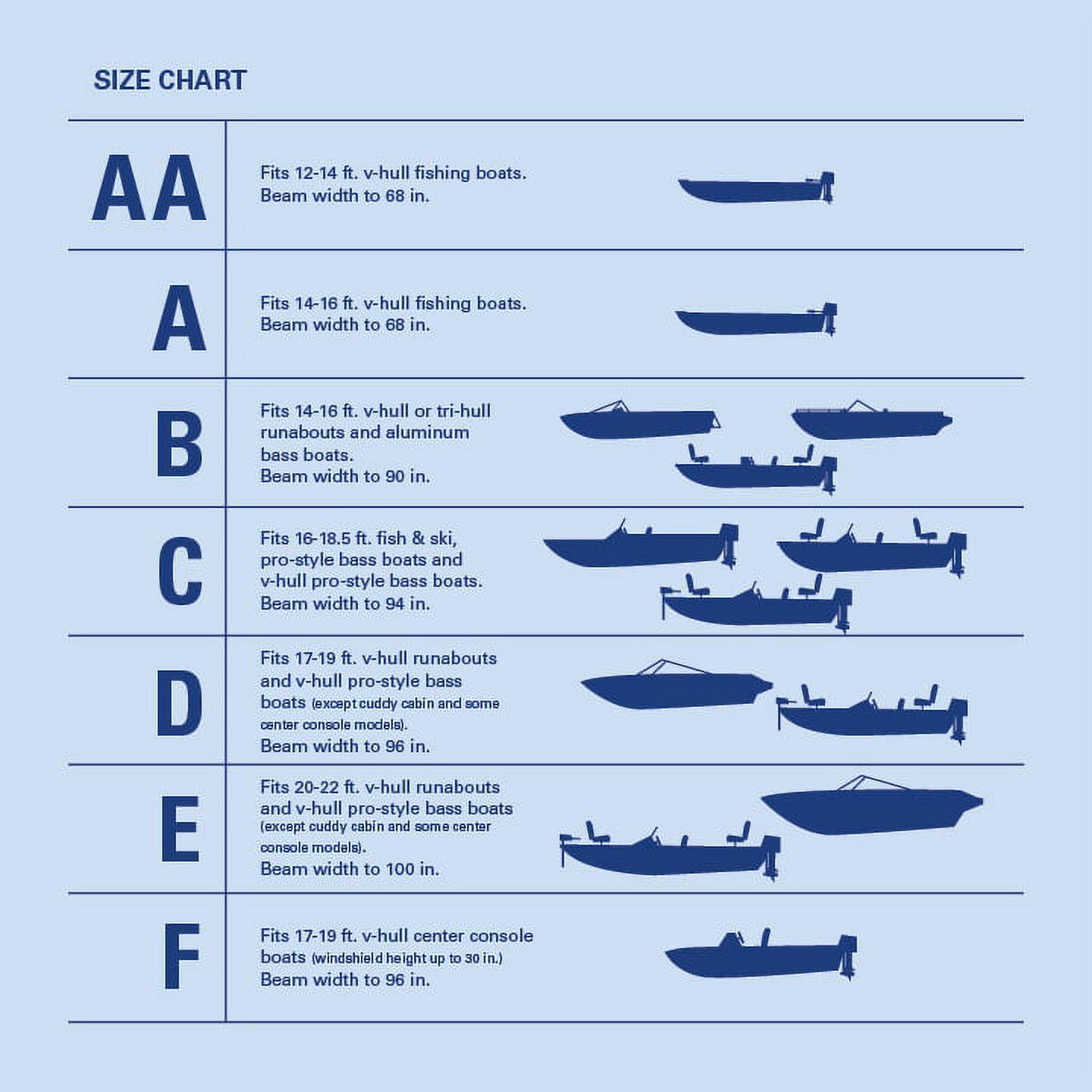 – Available in Sizes: 12′-14′, 68″ beam, 14′-16′, 68″ beam, 14′-16′, 90″ beam, 16′-18.5′, 94″ beam, 17′-19′ center console, 17′-19′, 96″ beam or 20′-22′, 100″ beam.