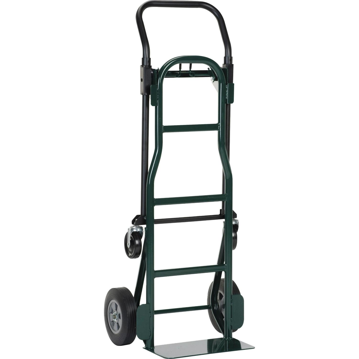 Four-in-one hand truck features a quick-change, convertible design that changes to four different truck positions and auto-locks into place with no pins or clips to lose. Solid rubber wheels and swivel casters allow easy maneuverability past bends and turns. Large base plate supports big and small items to transport a large collection of your supplies. Height-adjustable handle accommodates a wide range of users to help prevent strenuous movements during use. Heavy-duty, robotically welded steel frame provides long-lasting performance. Hand truck supports up to 700 lb.