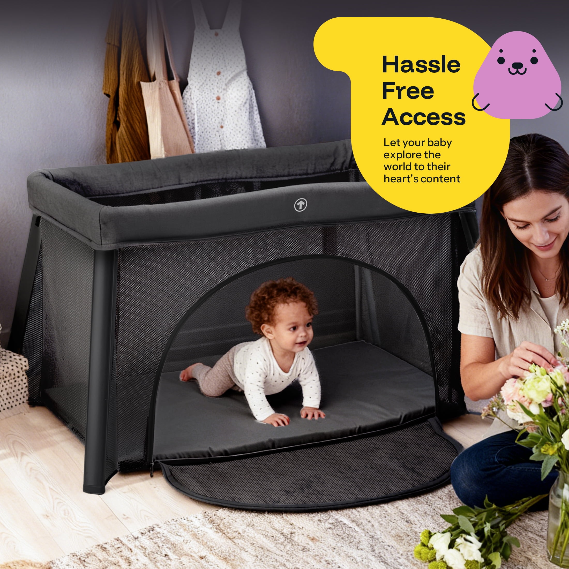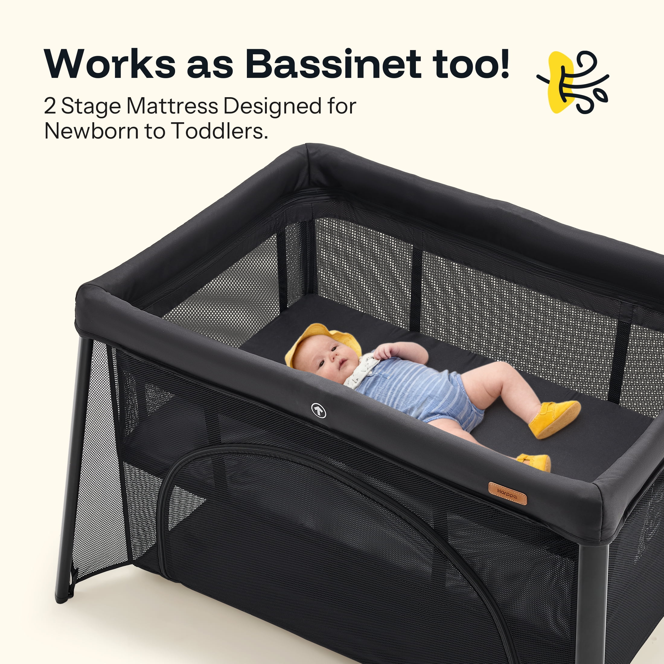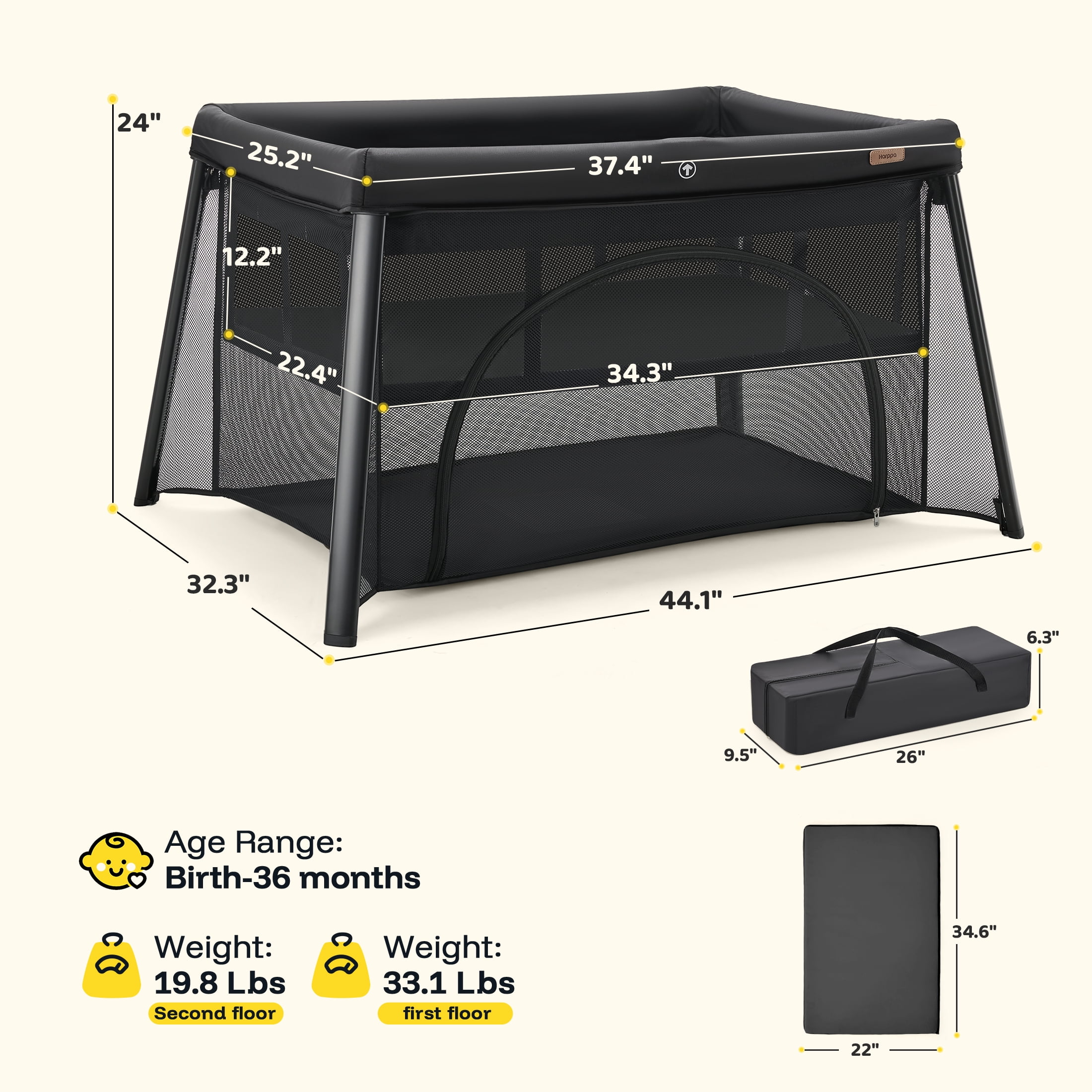 【2 IN 1 Portable Travel Crib】- 1. Baby Crib: The detachable mattress disposed in the middle gives baby a comfortable and safe resting environment. 2. Baby Playpen: Unzip the side zipper to remove the mattress to have a baby playard. 【Playard with Thick Mattress】This Playard comes with a 1.2-inch thick foldable and removable mattress, offering a cozy sleeping surface for your baby. Plus, it provides added protection for the Playard, promoting a safe and comfortable environment for your baby to grow. 【LIGHTWEIGHT & STABILITY】: This baby playard features a stable trapezoidal design that ensures even bottom support and prevents the crib from tilting, which improves the stability, so that your baby can play safely. This increases parents’ confidence in the safety of the playard. 【BREATHABLE DESIGN】: The sides of the crib are made of soft, breathable mesh fabric, which not only allows parents to see the baby, but also provides enough ventilation to ensure that the baby feels comfortable inside the pack n play. The zippered door design allows for easy placement and access to baby, making parent-child interaction easier. 【EASY TO SET UP AND FOLD】: This pack and play is lightweight and suitable for use at home and on the go. It features a folding design that makes it easy to set up and take down in seconds, which is very convenient. In addition, it comes with a carrying bag with an arm strap for easy portability, making it ideal for traveling. 【EASY TO CLEAN】: You don’t have to worry about your child making a mess of the crib. Just wipe it gently with a damp cloth and it will look brand new again in no time. This crib measures 40.5 x 32.2 x 26.3 inches and weighs 11.5 pounds. 【HARPPA Guarantee】We offer 30-day free returns and 2-year quality guarantee service for the baby walker. If you have any questions about our products, please feel free to contact us, we will reply and follow up within 12 hours until the problem is solved.