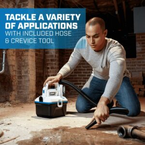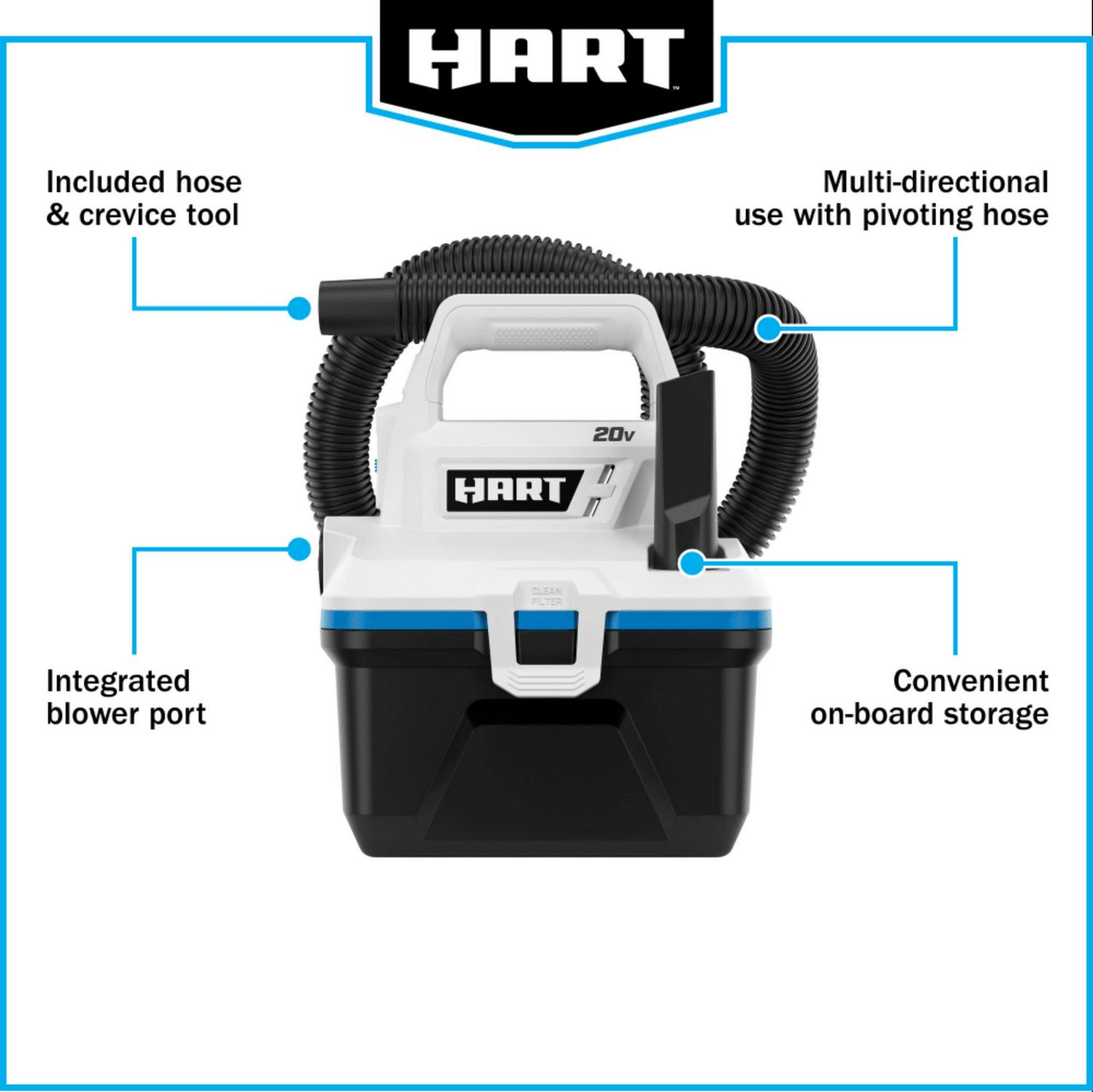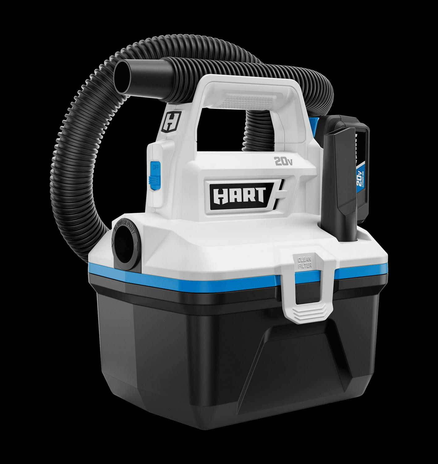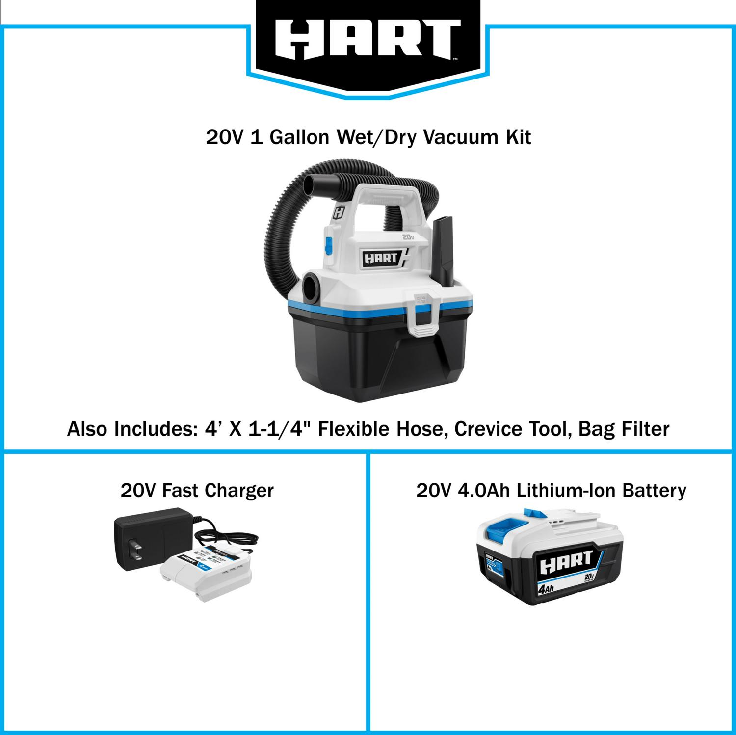 HART s 20V 1 Gallon Wet/Dry Vacuum cleans up messes of all sorts around the house. Along with sucking up sawdust, debris and pet hair, the 40 CFM gives it plenty of suction to clean up liquid spills like a broken pipe or your kid s spilled milk. The hose and crevice tool allow you to tackle a variety of applications. And the integrated blower port makes for quick cleanup. You can even dry off your deck after you power washed it. Another really nice thing about this cordless vac is its relatively small footprint. The lightweight, compact design makes it easy to tuck away in a corner of the garage or next to a workbench. It also comes with an onboard storage for convenient access to accessories and a pivoting hose for multi-directional use. Kit includes: 1 gallon Wet/Dry Vac, 4 x 1-1/4 flexible hose, crevice tool, bag filter, 4.0Ah battery, charger and operator s manuals.