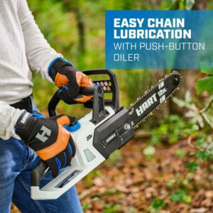 The HART 20V 12-inch Brushed Chainsaw provides the perfect solution for your light trimming and pruning needs. The HART 20V 12 Brushed Chainsaw is ideal for light limbing and trimming small trees and bushes around the yard. The rear comfort grip provides enhanced user comfort and reduced user fatigue during extended periods of use. The push button oiler instantly lubricates your chainsaw blade, ensuring fast and smooth cuts during every use. The HART 20V 12-inch Chainsaw provides a 10″ maximum cutting diameter, which is perfect for cutting through small limbs and trees around the house. The HART 20V Battery (Not Included) is compatible with all HART 20V tools. The HART 20V Brushed Chainsaw is covered by a 3-year limited warranty.