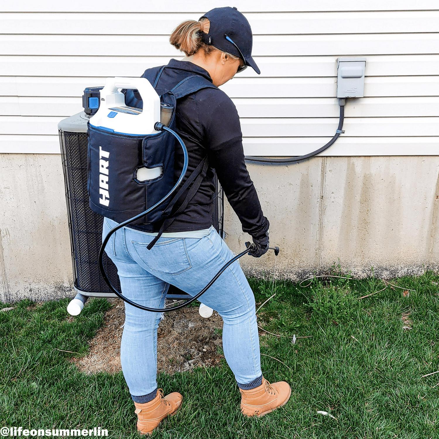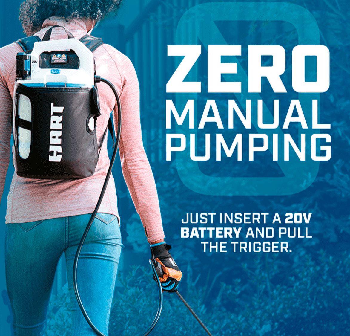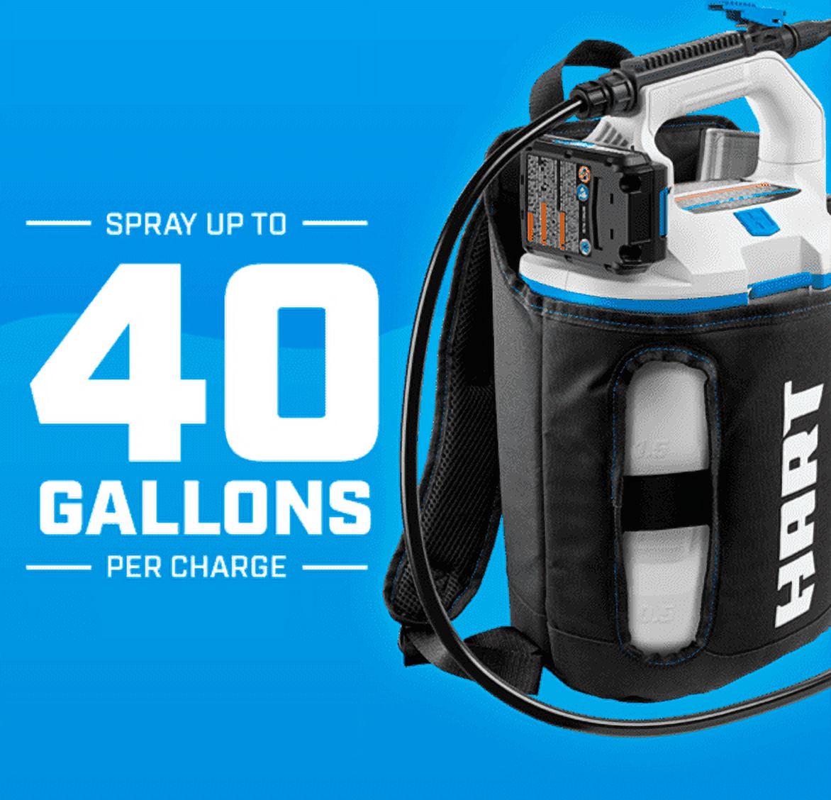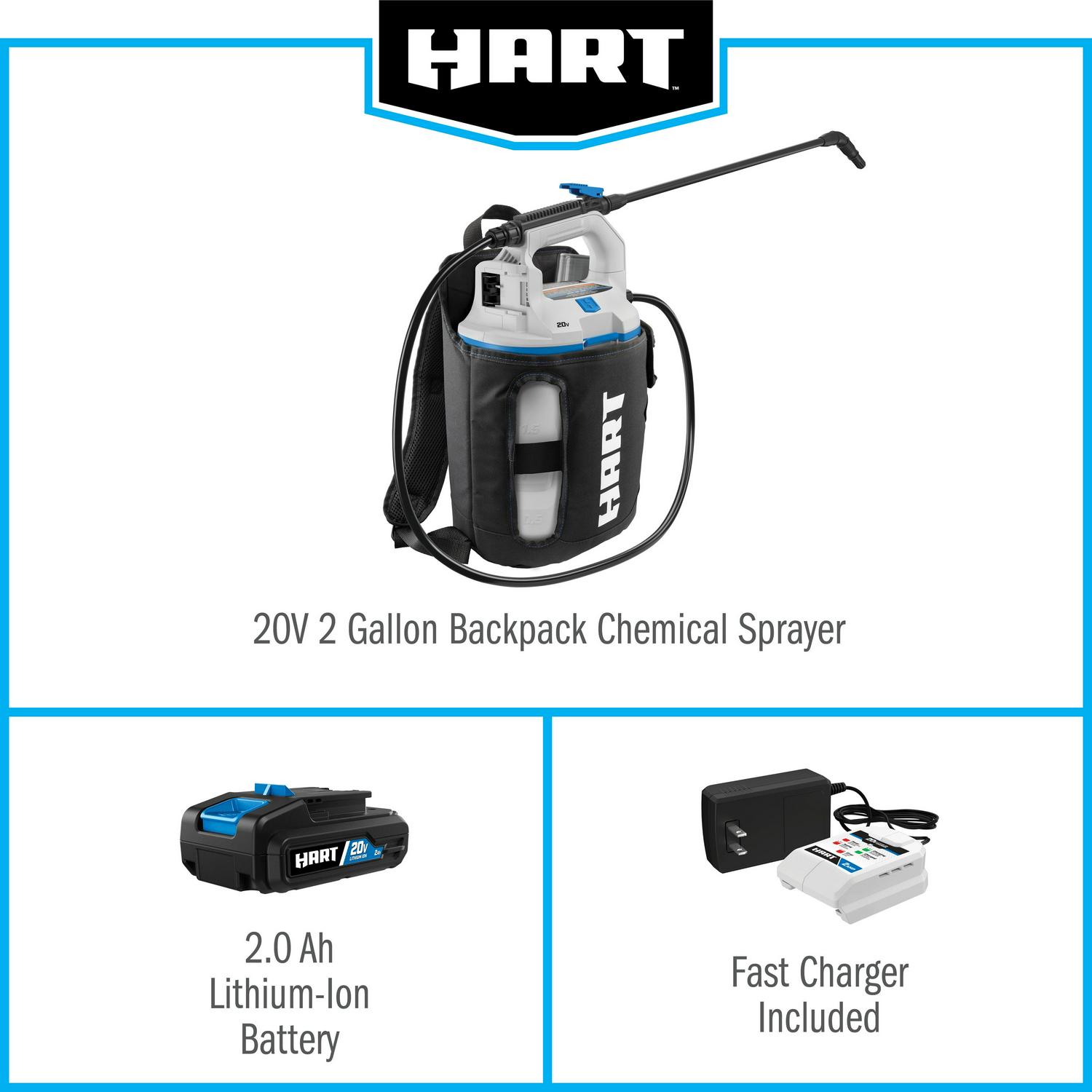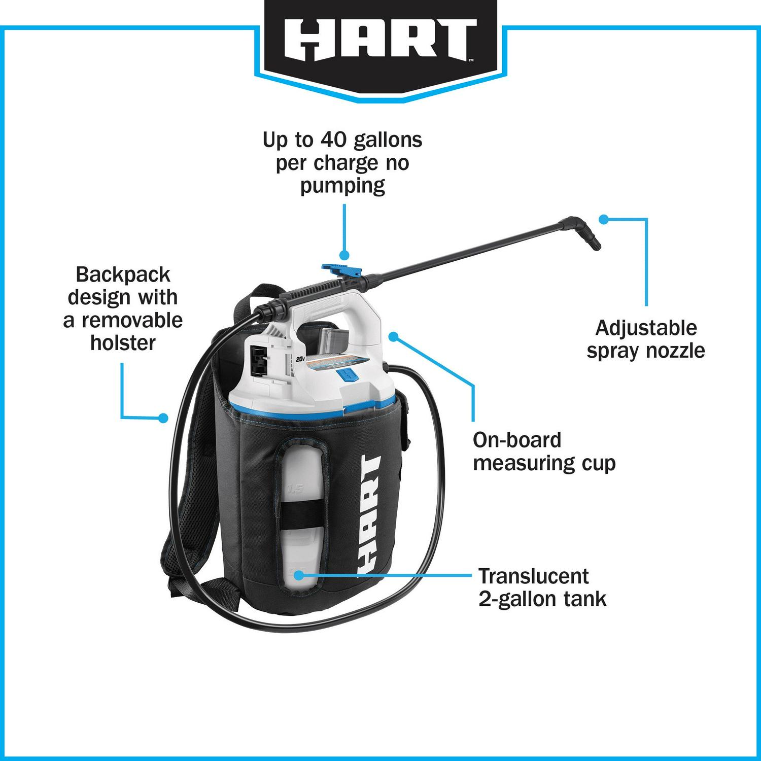 Keep your yard free of insects, mold and weeds with the HART 2-gallon chemical sprayer. No pumping required; the 2-gallon chemical sprayer is a great alternative to a manual chemical sprayer. Includes an on-board measuring cup and adjustable nozzle for user convenience. Either carry the sprayer by hand or us it as a backpack with the included holster. Up to 40 gallons per charge.
