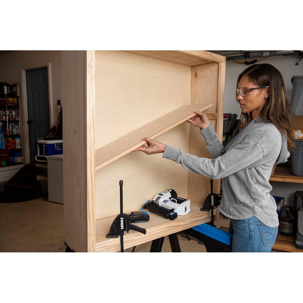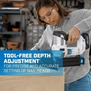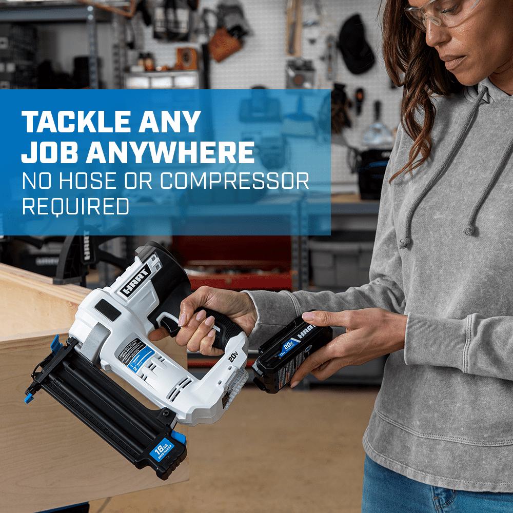HART s 18-Gauge 2 Brad Nailer eliminates the need for noisy compressors, bulky air hoses and expensive gas cartridges. It s also ideal for using when climbing ladders or locations with limited power. This tool uses nails as short as 5/8 to as long as 2 and can be used for a variety of applications, from interior trim work to hallway board and batten to assembling craft projects. With a magazine capacity of 105 brad nails, it can fire off 600 nails per charge (w/ 1.5Ah Lithium-Ion Battery). The tool-free depth adjustment allows for proper setting of nail heads. And you ll have easy access to clear nails with tool-less jam release. The nailer features an integrated LED work light to illuminate the work space.