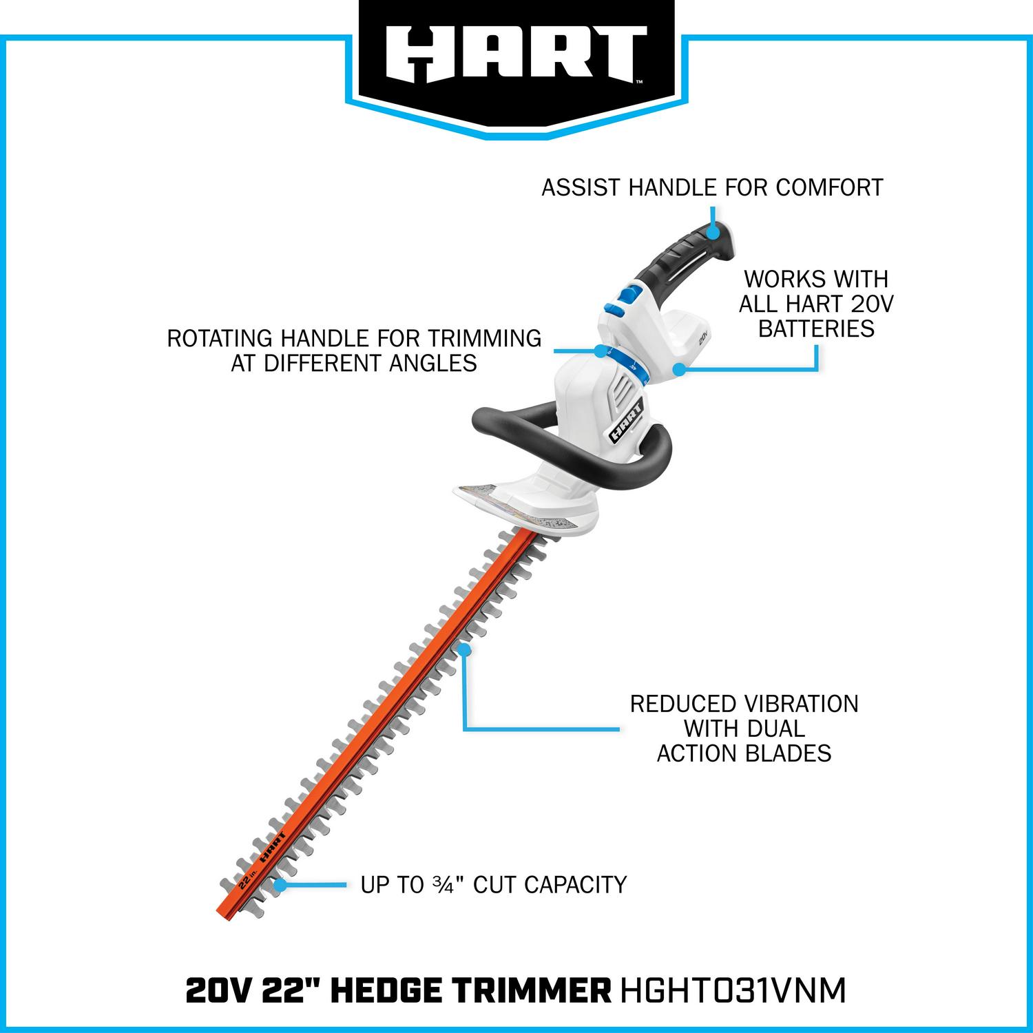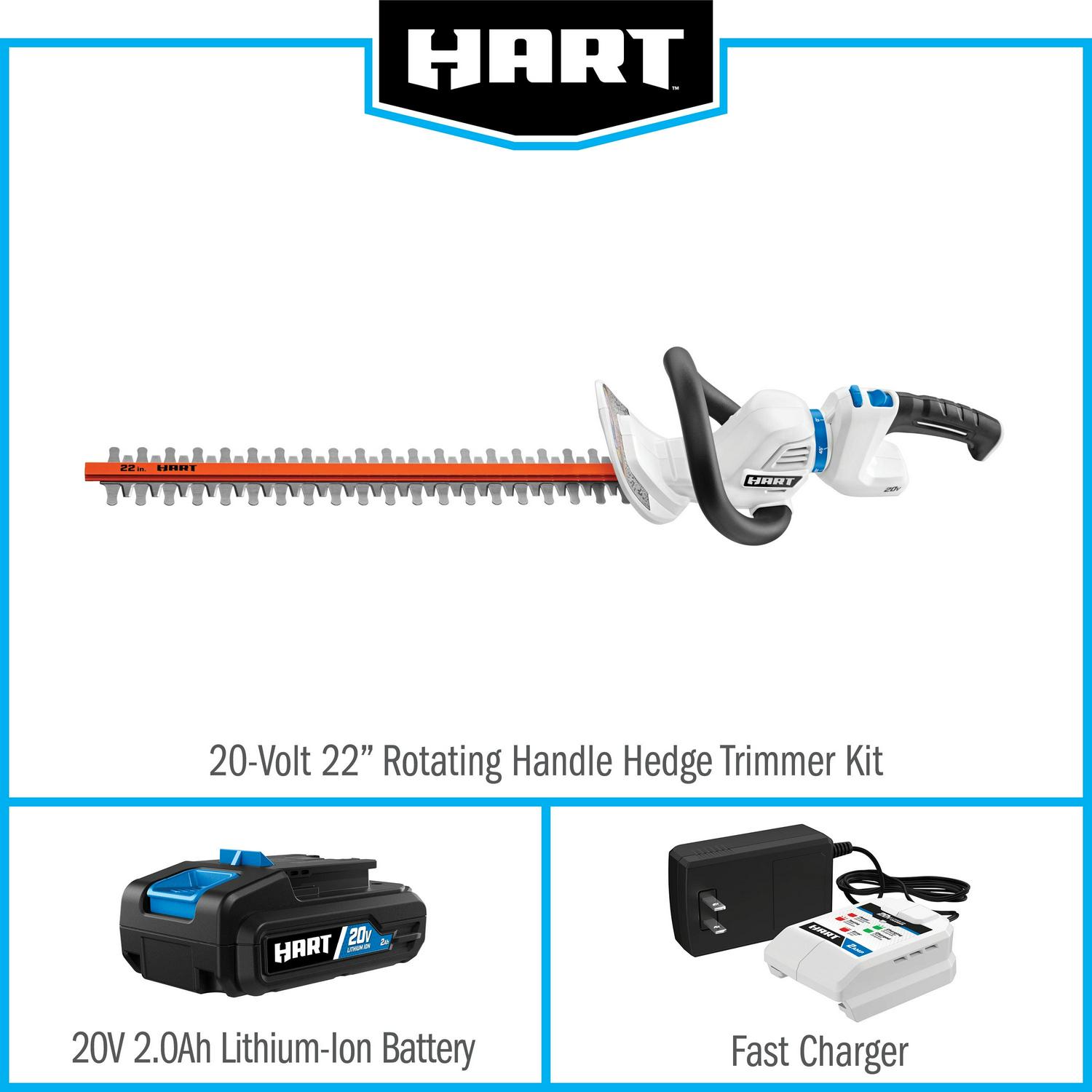 Trimming hedges is enough work, the last thing you need is having to work around an extension cord or suck in gas fumes. That s why you ll like our cordless 20V 22 Rotating Handle Hedge Trimmer Kit. With up to a 3/4 cutting capacity and 180º all angle trimming with rotating handle, it s ideal for medium-duty hedge trimming. Lightweight, compact design makes it easy to use and the dual action blades help reduce vibrations, giving you less fatigue and more control while cutting. The 22 blade size lets you quickly slice away unruly branches and restore your hedges to their neat, clean shape. Apart from that this battery-powered trimmer is cordless, so you re free to work anywhere without tripping over or getting tangled up in cords. And it runs on the same 20V platform, so you can use the same battery you use for all your other 20V HART tools. Includes 20V Hedge Trimmer, 2.0Ah Lithium-ion Battery, Fast Charger, blade cover & operator s manuals.