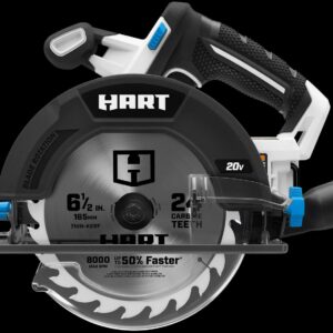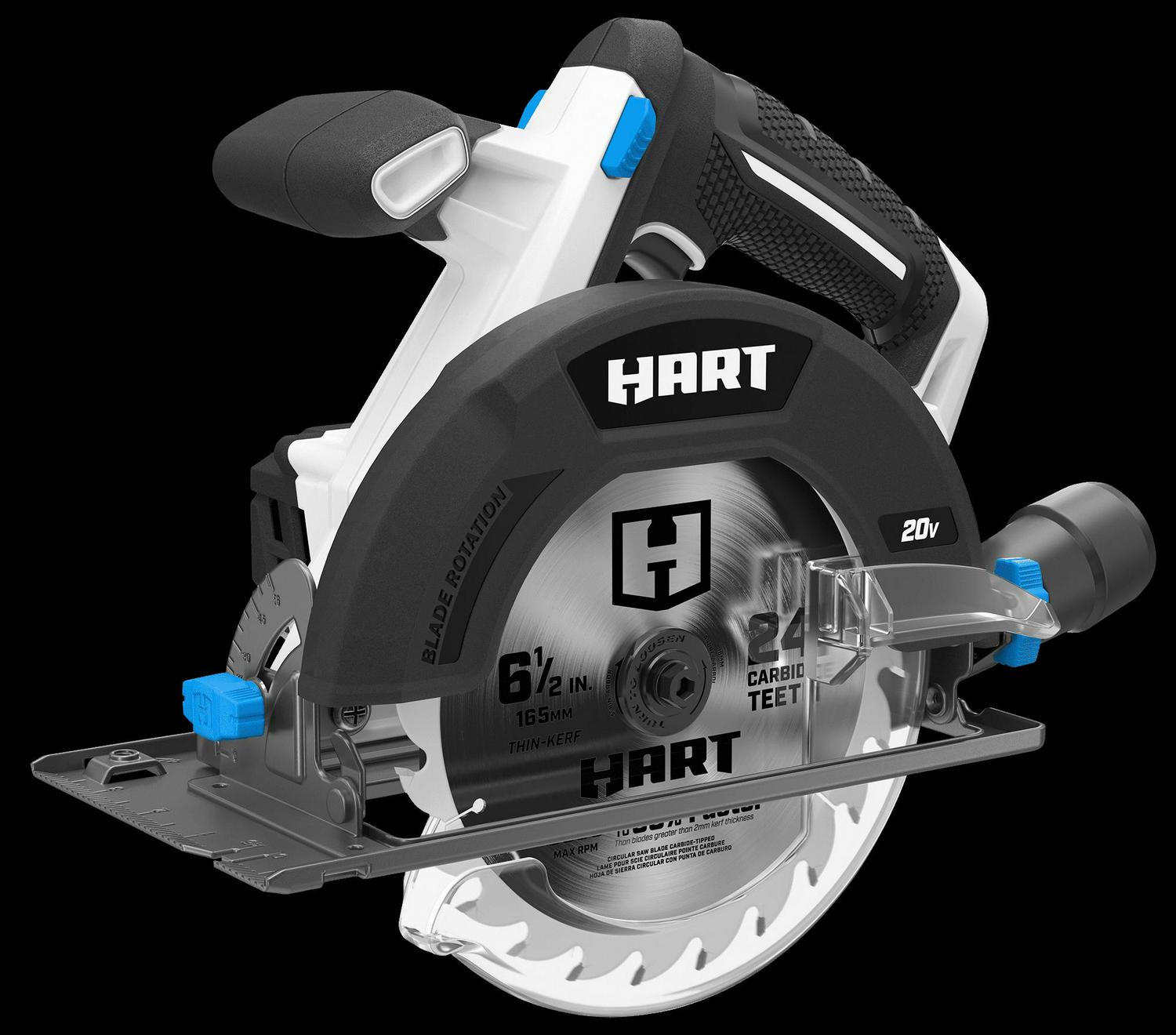 – HART 20V 6-1/2″ Circular Saw: 4,700 RPM for fast speed cutting, 0°-56° bevel, up to 2-1/16″ depth of cut, 24T carbide tipped thin kerf blade, 5/8″ arbor & vac attachment