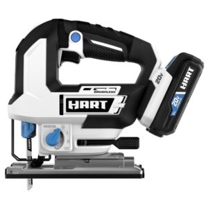 If you re a beginning woodworker or a DIY warrior, this HART 20-Volt Brushless Orbital Jigsaw is a must-have. This jigsaw is a powerhouse with a blistering 800-3,350 SPM and a stroke length of 1 inch. It ll definitely cut through anything you throw at it. And because it s brushless, you can expect up to 58% longer runtime** and up to 36% faster cutting speeds when compared to HART s brushed counterpart. It features 4-position orbital settings for increased versatility. The orbital action tears through wood with a 0-45º bevel cut that bevels left and right. To change the bevel, open the level and decide which angle you want to cut. No extra tools are needed. The orbital can also be turned off to make straight cuts. The major features are a lock-on switch for uninterrupted cutting, an onboard LED light to illuminate the workspace, and a non-marring shoe to protect delicate work surfaces. Includes: (1) 20V Brushless Orbital Jigsaw, (1) T-shank Wood Cutting Blade, (1) Non-Marring Shoe, and (1) Operator’s Manual.