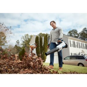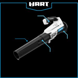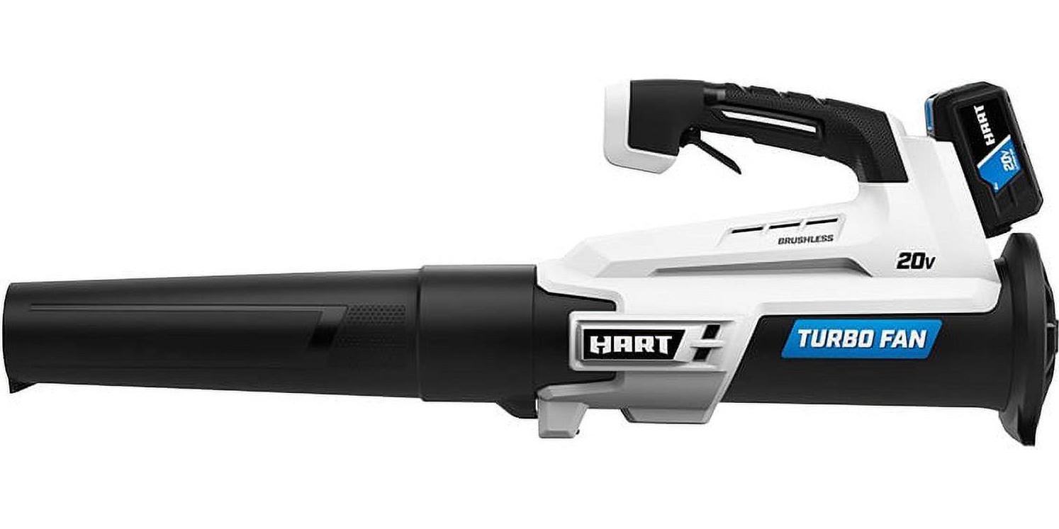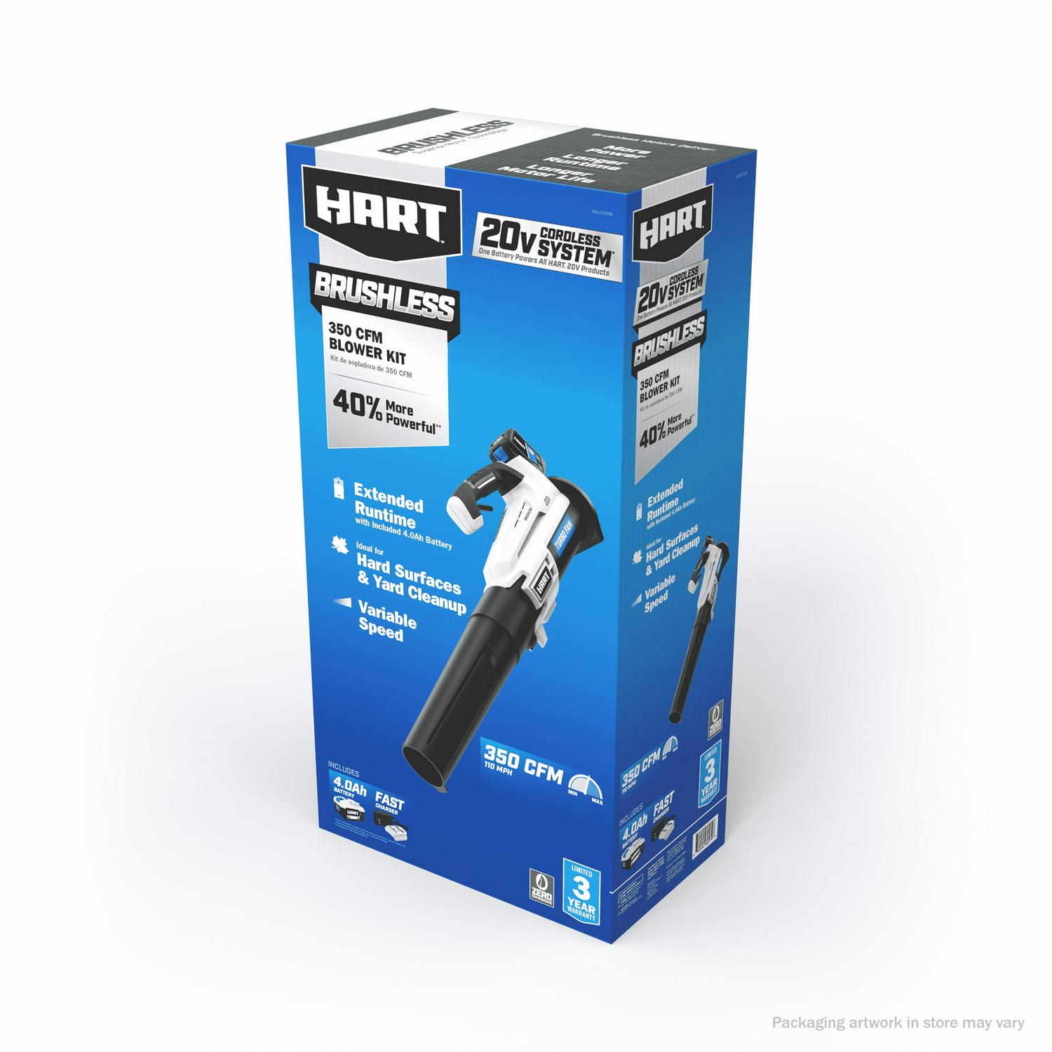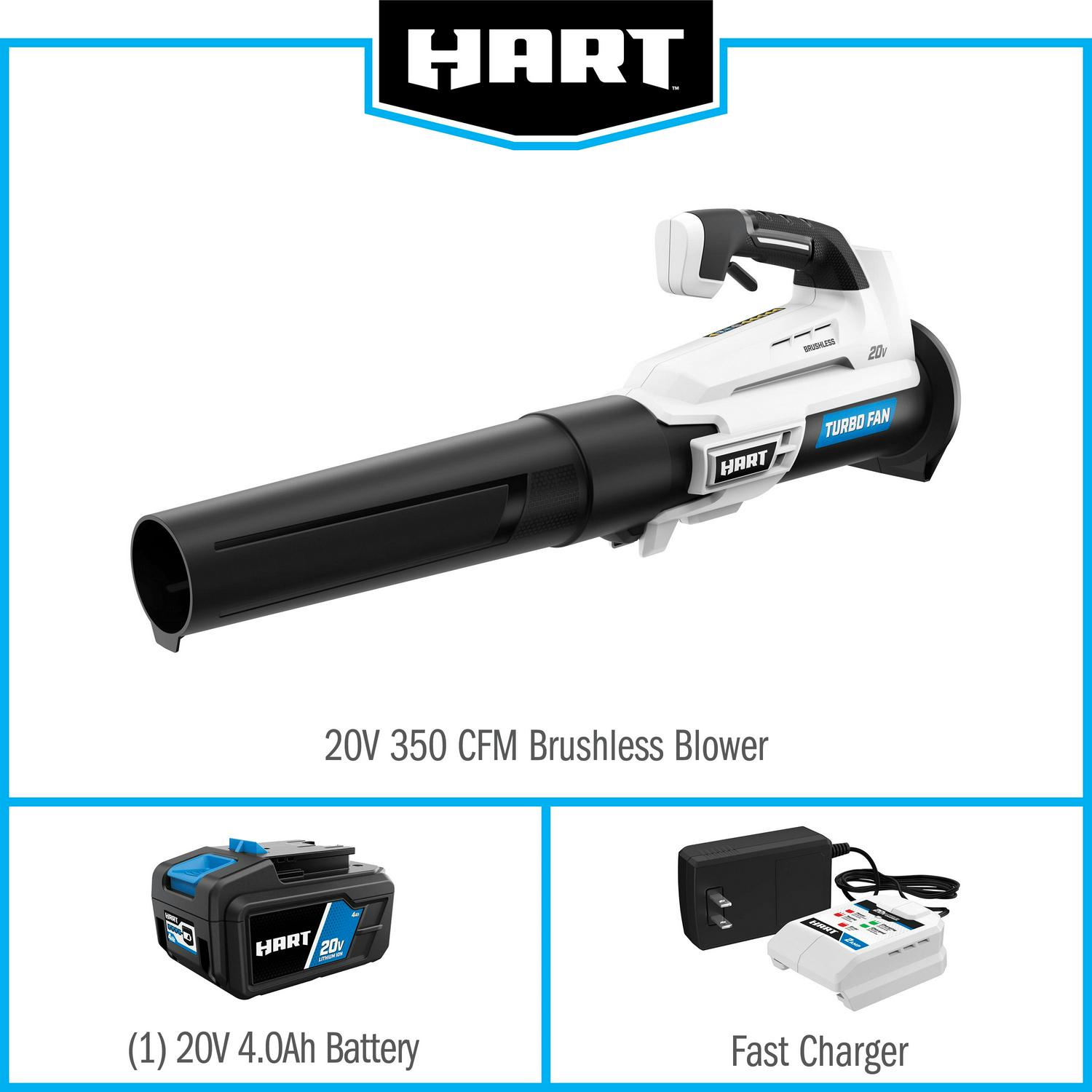 Ditch the garden rake, it s time to upgrade to the HART 20V Brushless Turbo Fan Blower. With the brushless motor and innovative turbo fan design that maximizes air velocity and delivers twice the clearing power, this cordless blower is a powerful tool to have in your tool shed. It provides 350 CFM and 110 MPH of power for stronger debris removal from your yard. And for large yards, the variable speed trigger provides more user control, from maximum clearing power to more focused blowing. It also comes with a brushless motor, which is far more efficient than a brushed motor, runs longer and has a longer lifespan. The included 20V battery is compatible with all HART 20V tools. Blower and battery are covered by a limited 3-year warranty. Includes: Turbo Fan Blower, blower tube, 4.0Ah Lithium-ion battery, fast charger and operator s manuals.