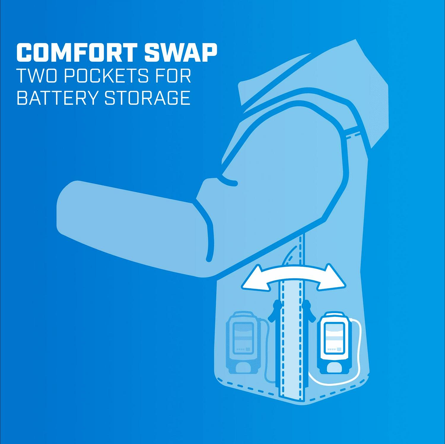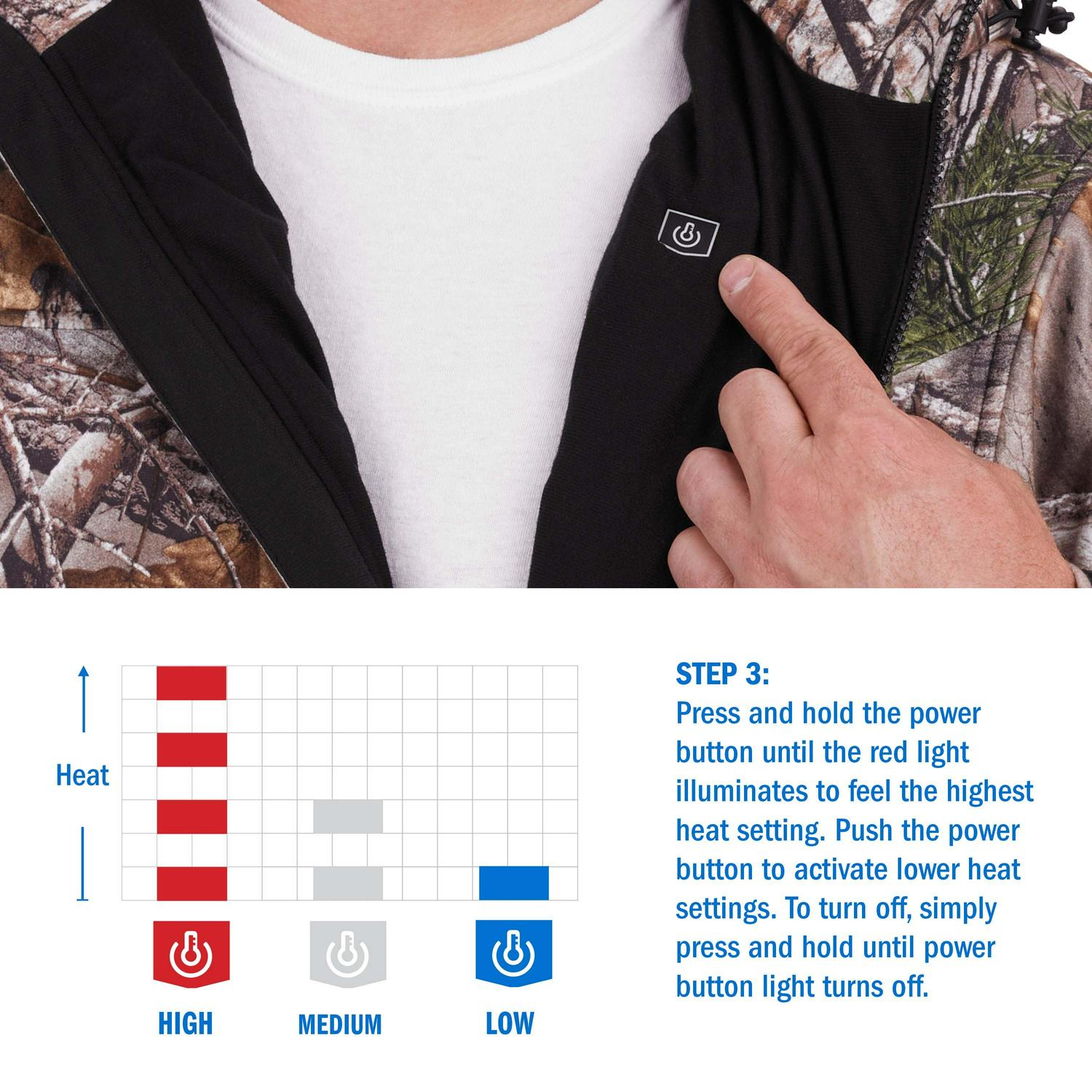 - 3 heating zones: Left chest, Right Chest, Mid-Back