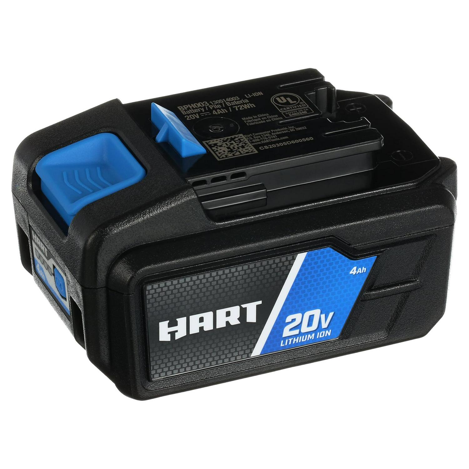 The HART 20V 4.0Ah Lithium-Ion battery is an excellent addition, or start to, any DIYer s HART tool collection. This battery is compatible with all HART 20V power tools. It features Lithium-Ion technology to give you long-lasting and fade-free power to get you through any project you decide to take on. This battery is designed to be compact and lightweight for more maneuverability and while reducing user fatigue. Whether you are maintaining your yard with HART outdoor tools, cleaning and maintaining your car with HART automotive tools or keeping cool and entertaining with HART lifestyle tools, the HART 20V 4.0 Ah battery is there to provide the power you need when you need it with 4x longer runtime than the HART 20V 1.5 Ah Lithium-Ion battery.
