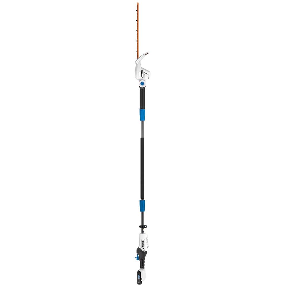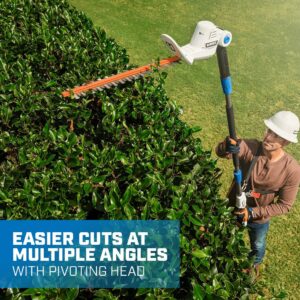 You ll love our HART 20 Volt Pole Hedge Trimmer it makes the process much easier and safer. The 5 -8 pole extension helps to trim those hard-to-reach hedges with minimal strain on your back. It also features 18″ dual-action blades for reduced vibration and a 5/8 cut capacity for seamless trimming. And because tall hedges can have a mixture of odd angles, heights and different hedge shapes, this trimmer provides the solution with its pivoting head a, which allows for easier cuts at multiple angles. If you also factor in the rear comfort grip handle that helps minimize user fatigue and the instant starting motor, you ve got yourself the best tool for trimming tall hedges. Includes: Pole Hedge Trimmer Attachment, intermediate shaft, power head, blade cover, shoulder strap, 2.0Ah Lithium-ion battery, fast charger and operator’s manuals.