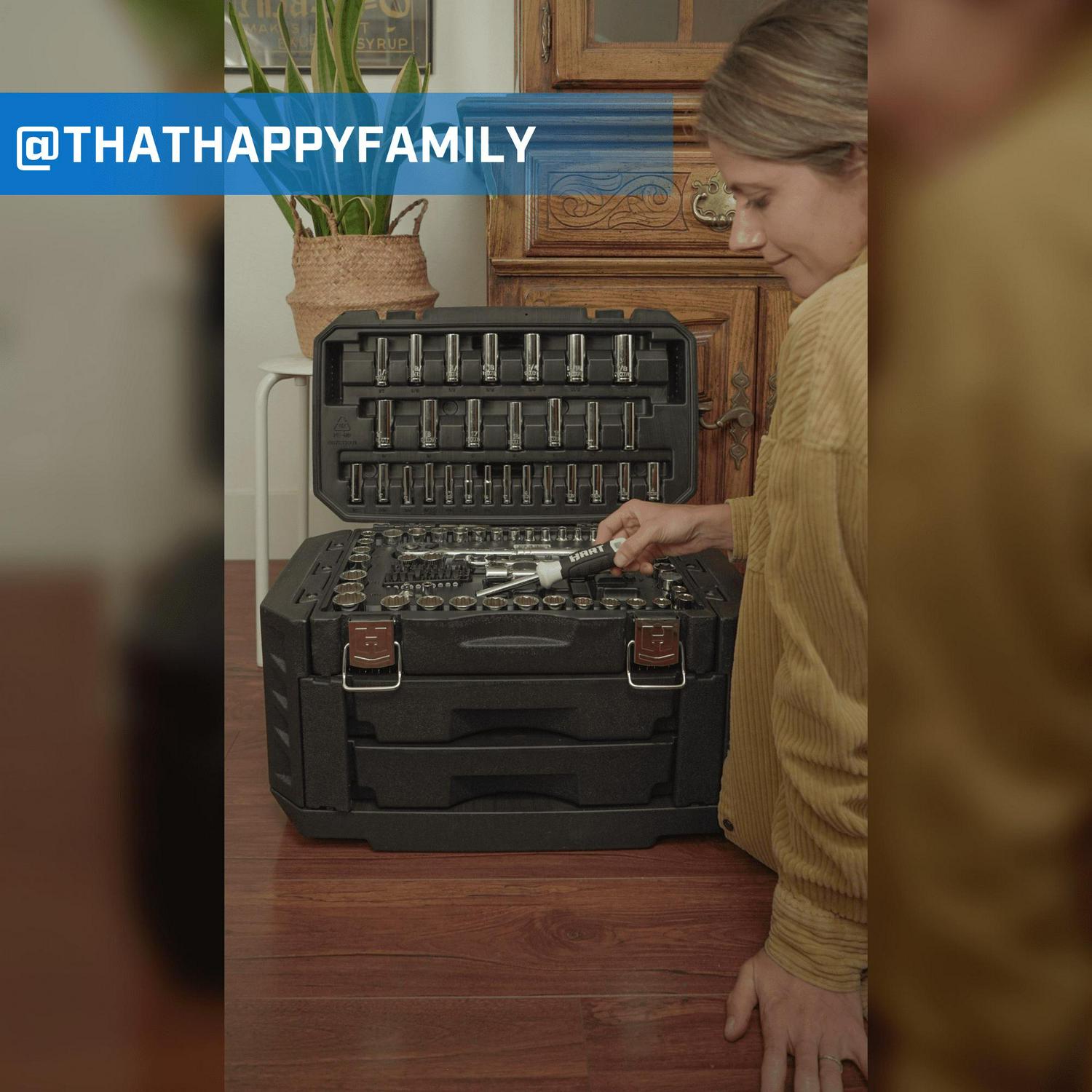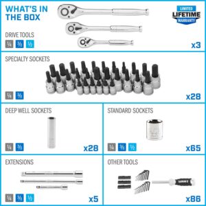 – Includes: (1) Case (13) TOOLS: 1/4″ RATCHET, 3/8″ RATCHET, 1/2″ RATCHET, 1/4″ DRIVE BIT DRIVER, 1/4″ DRIVE 3″ EXTENSION, 3/8″ DRIVE 3″ EXTENSION, 1/2″ DRIVE 3″ EXTENSION, 1/4″ DRIVE 6″ EXTENSION, 3/8″ DRIVE 6″ EXTENSION, 1/4″ DRIVE BIT ADAPTOR, 3/8″ DRILL DRIVER ADAPTOR, 3/8″ DRIVE UNIVERSAL JOINT, 3/8″ DRIVE TO 1/4″ ADAPTOR (16) HEX BIT SOCKETS, (6) 1/4″ DRIVE COMBO STAR BIT SOCKETS, (23) 3/8″ SOCKETS, (21) 1/4″ SOCKETS, (14) 3/8″ DEEP WELL SOCKETS, (14) 1/2″ DEEP WELL SOCKETS, (18) NUT DRIVER BITS, (21) 1/2″ DRIVE SOCKETS,(20) SHORT ARM HEX KEYS, (43) 1″ INSERT BITS