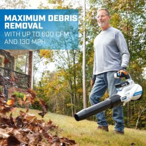 This 40V Brushless 600 CFM Blower Kit will make fall cleanup feel so new and easy. This tool not only clears stubborn materials such as wet leaves, but also lifts and moves twigs, grass clippings, and more. And it does so quickly and efficiently. The turbo fan design provides 600 CFM and 155 MPH of maximum clearing power, while the variable speed trigger gives you total control. Lightweight, compact design provides the ultimate user comfort during extended periods of use. Plus, there s no stubborn start-up cord to deal with. Just press the turbo button for maximum clearing power. Battery power also eliminates the fumes and mess that come with gas-powered blowers. Brushless Motor Technology delivers more power, longer runtime, and longer motor life. Plus, it s cordless, so you re free to work anywhere without tripping over or getting tangled up in cords. Finally, the *Ultra-Quiet Technology* makes it our quietest blower to date. The included 40V 4.0Ah battery is compatible with all HART 40V tools. Disclaimer: *compared to brushed blower.