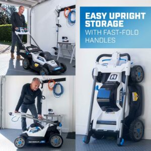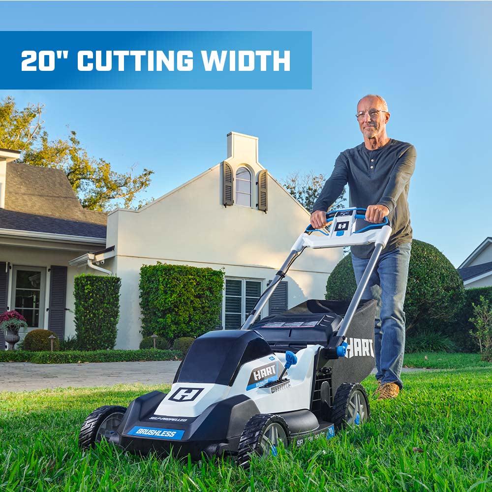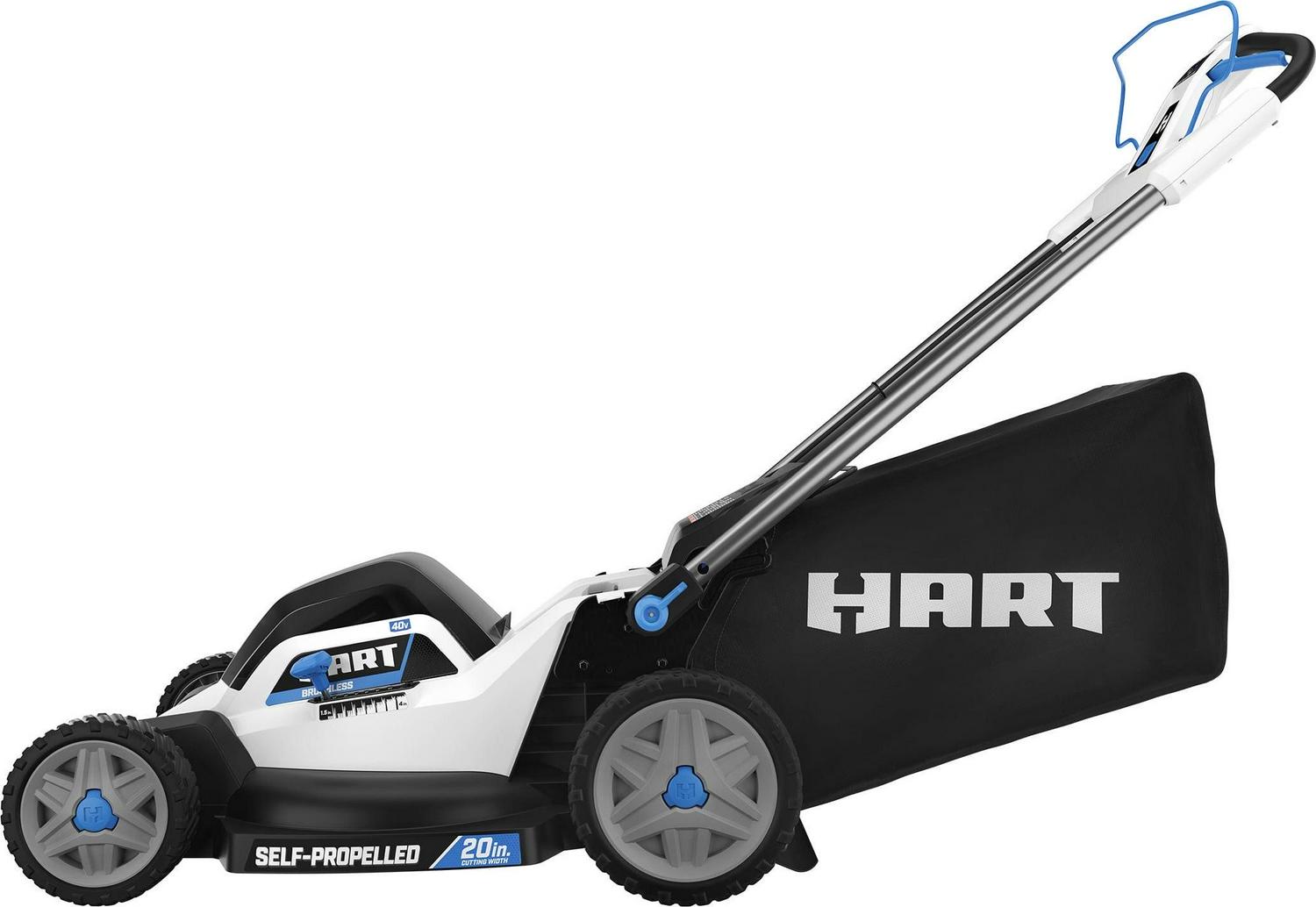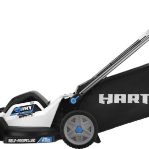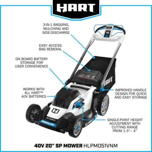 Go cordless with this battery-powered 40V 20 Self-Propelled Mower from HART. This mower cuts up to ½ acre on one charge. Choose how you want to mow with 3-in-1 bagging, mulching, and a side-discharge chute. Oh, and that annoying pull cord It s gone. This battery-powered machine starts with just the push of a button. Height modifications are also easily made with a single-point height adjustment knob (1-1/2″-4″ cutting range) instead of adjusting each wheel individually. Onboard battery storage carries 2 batteries at once, so when your first battery runs down, you have a spare to finish the job. Another time saver is the included fast charger, which charges 2x faster than a standard 1.5Ah charger. When you re done, the FAST FOLD handles make for easy upright storage. Works with All HART 40V Batteries. Includes: (1) 40V 20 Self-Propelled Mower, (1) 40V 6.0Ah Lithium-Ion Battery, (1) 40V Fast Charger, (1) Grass Catcher Bag, (1) Side Discharge Chute, (1) Start Key, (1) Mulch Plug, and (1) Operator s Manuals. Disclaimer: *Compared to standard 1.5A charger